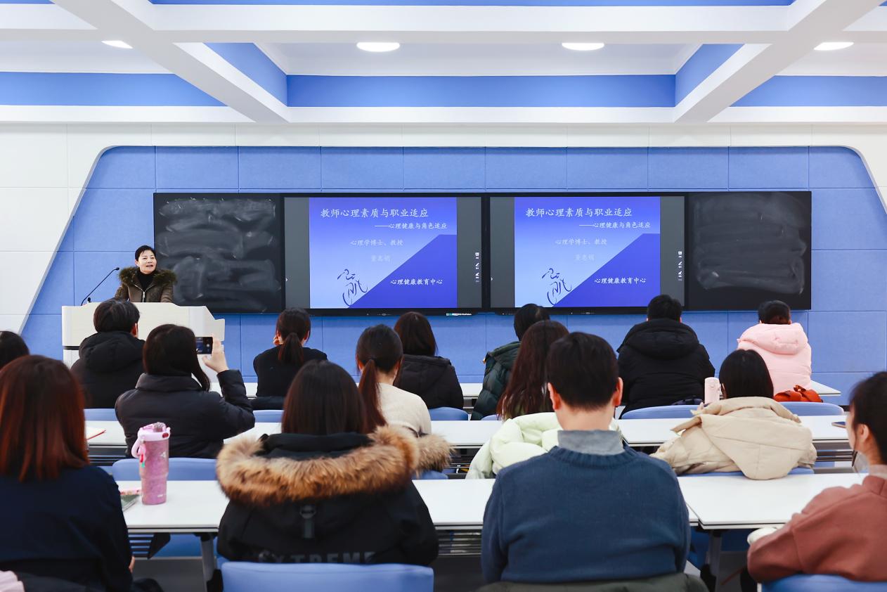 董教授围绕教师职业特点、心理适应机制及心理健康维护策略展开深入讲解。她结合当前教育实际,分析了部分教师在角色转型、工作压力、人际关系等方面面临的挑战,并提出“认知重构”“成长型思维”“理性评估”等实用方法,引导教师走出认知误区,实现心理素质与职业角色、工作需求的动态匹配。