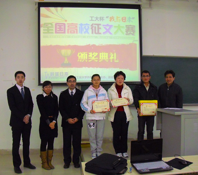 首届工大杯“我与日本”全国高校征文大赛颁奖仪式, 11月21日在我院隆重举行。大赛主办方—我校日语专业校外实践教学基地蔚蓝网暨蔚蓝杂志社的代表专程来我校为获奖学生颁奖。