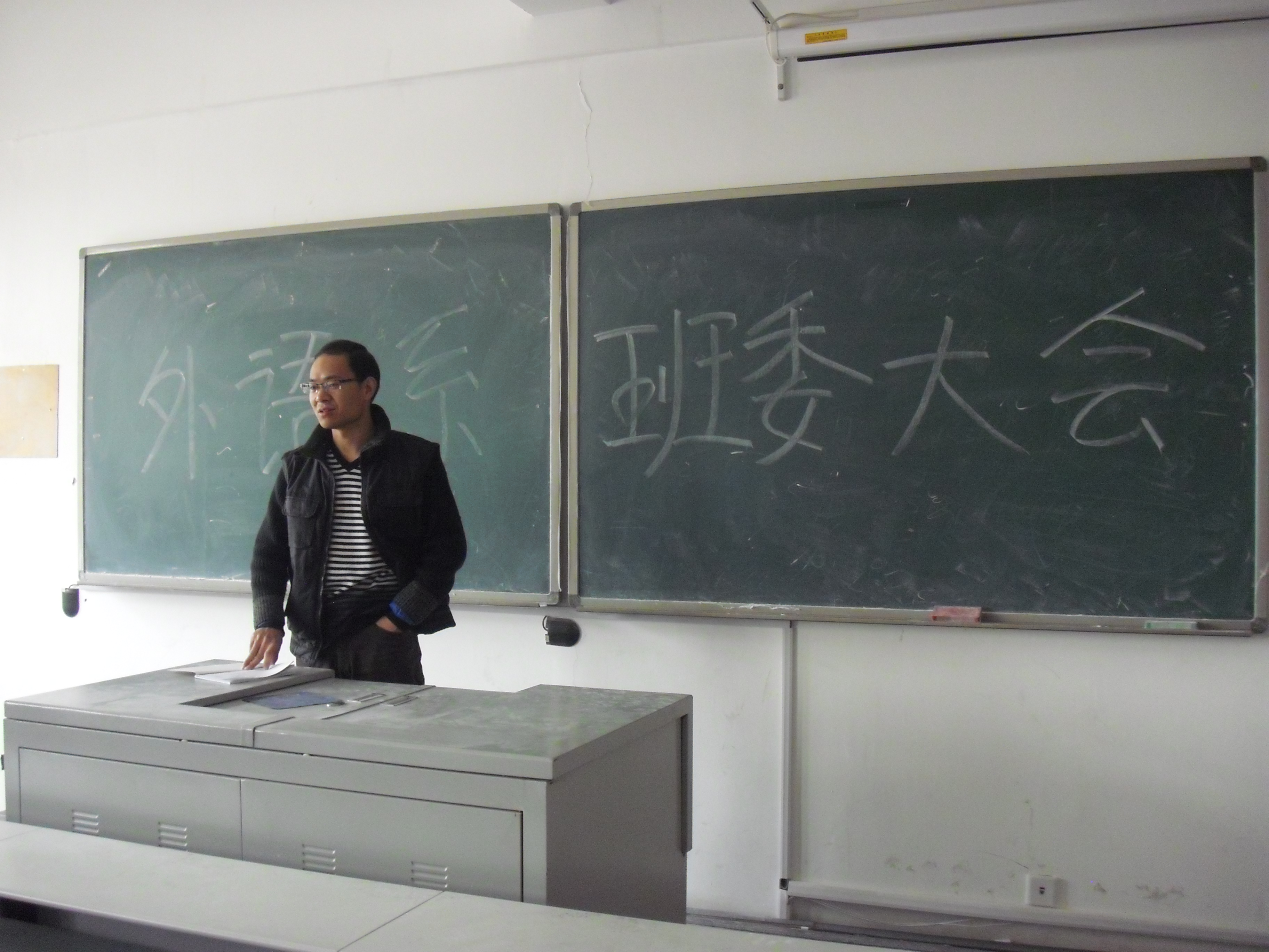 (学生记者日语1211 杨玉洁)4月17日中午12点,外语系班委大会在老上善318举行。辅导员胡永友老师,学生会主席团、各部部长以及各班班长、团支书、学习委员参加了本次大会。