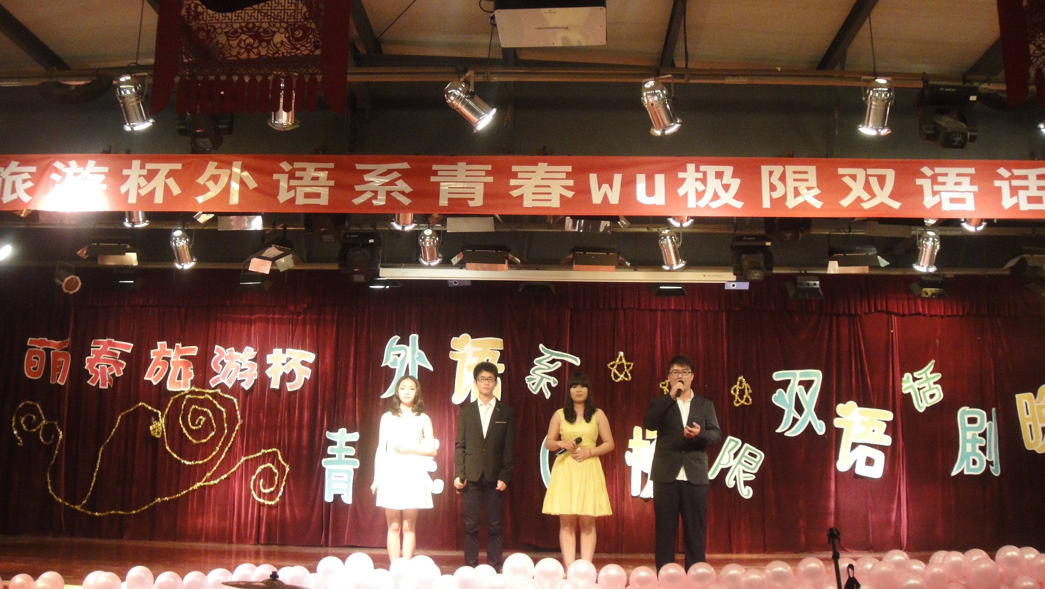 (学生记者 甄慧娜 英语1218 )2013年4月24日下午六点半由外语系举办的萌泰旅游杯青春无极限双语话剧晚会在素质教育中心成功举行,出席晚会的有萌泰旅游社经理,外语系辅导员胡勇友老师,管理系辅导员李坤老师及李若曦、胡志坤、唐胄、秦小明、李俊兰等老师。