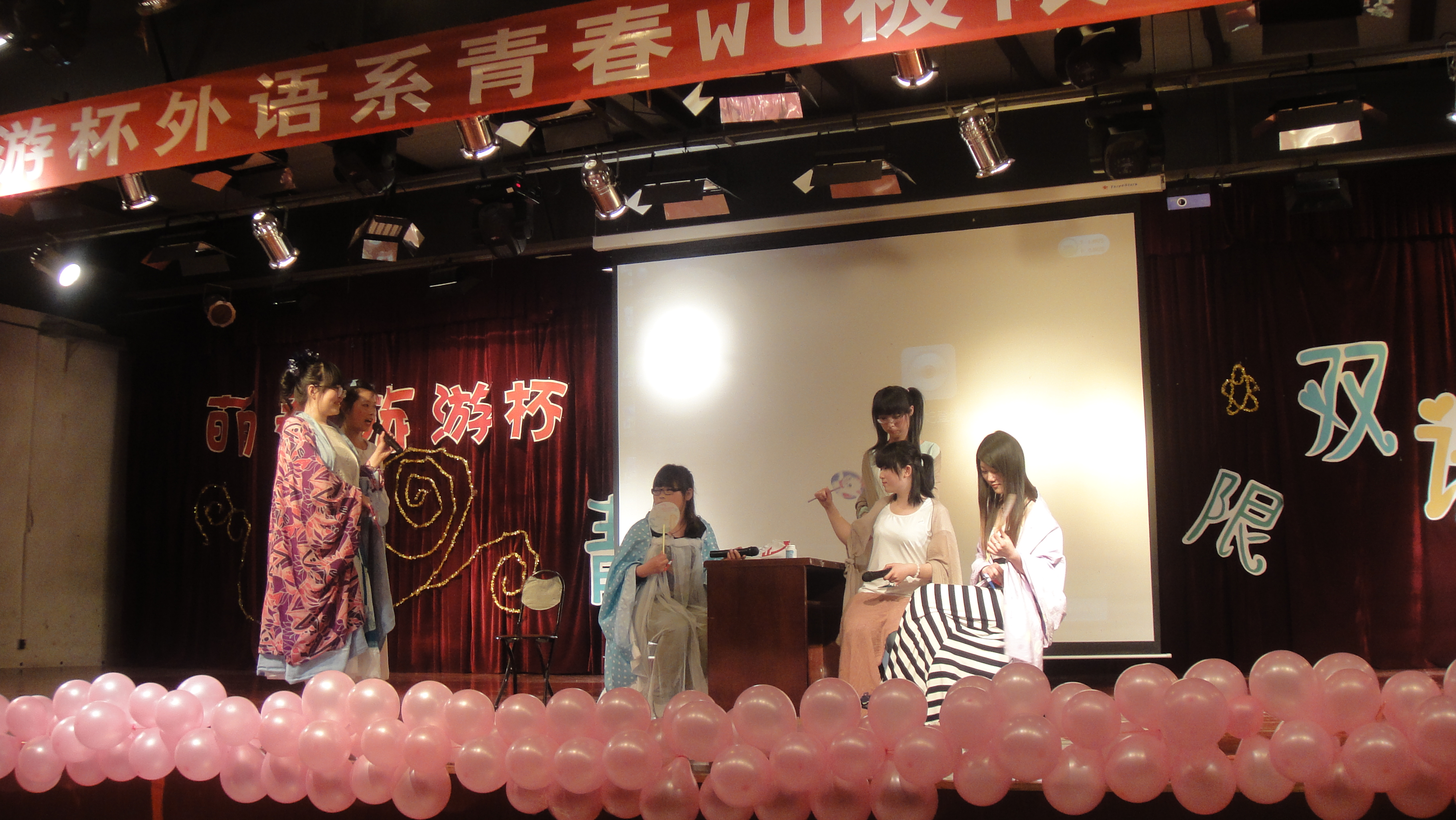 在一首激昂的摇滚歌曲和开场舞的铺垫下,话剧比赛拉开帷幕,六支参赛团队展开激烈的角逐,《新编甄嬛》中华丽的服饰及餐饮用具等充足的道具将角色演绎的淋漓尽致。《倩女幽魂之九二房租》形式新颖,由男生进行的反串饰演赢得现场阵阵掌声。此外还有《公主在囧途》和《孔雀东南飞》等精彩节目。整场比赛高潮迭起,惊喜连连,将现场氛围推向一个又一个高潮。经过两个小时的激烈角逐,日语1213班的《新编甄嬛》以全场最高分赢得本次比赛的第一名,日语1212班《倩女幽魂之九二房租》的和日语1211班的《公主在囧途》分别荣获本次比赛的第二名和第三名。