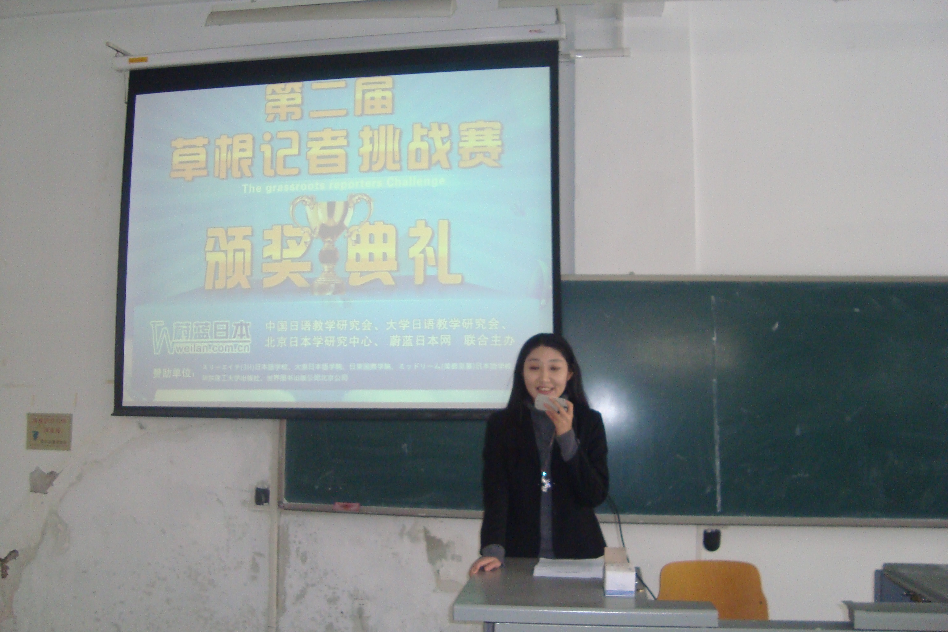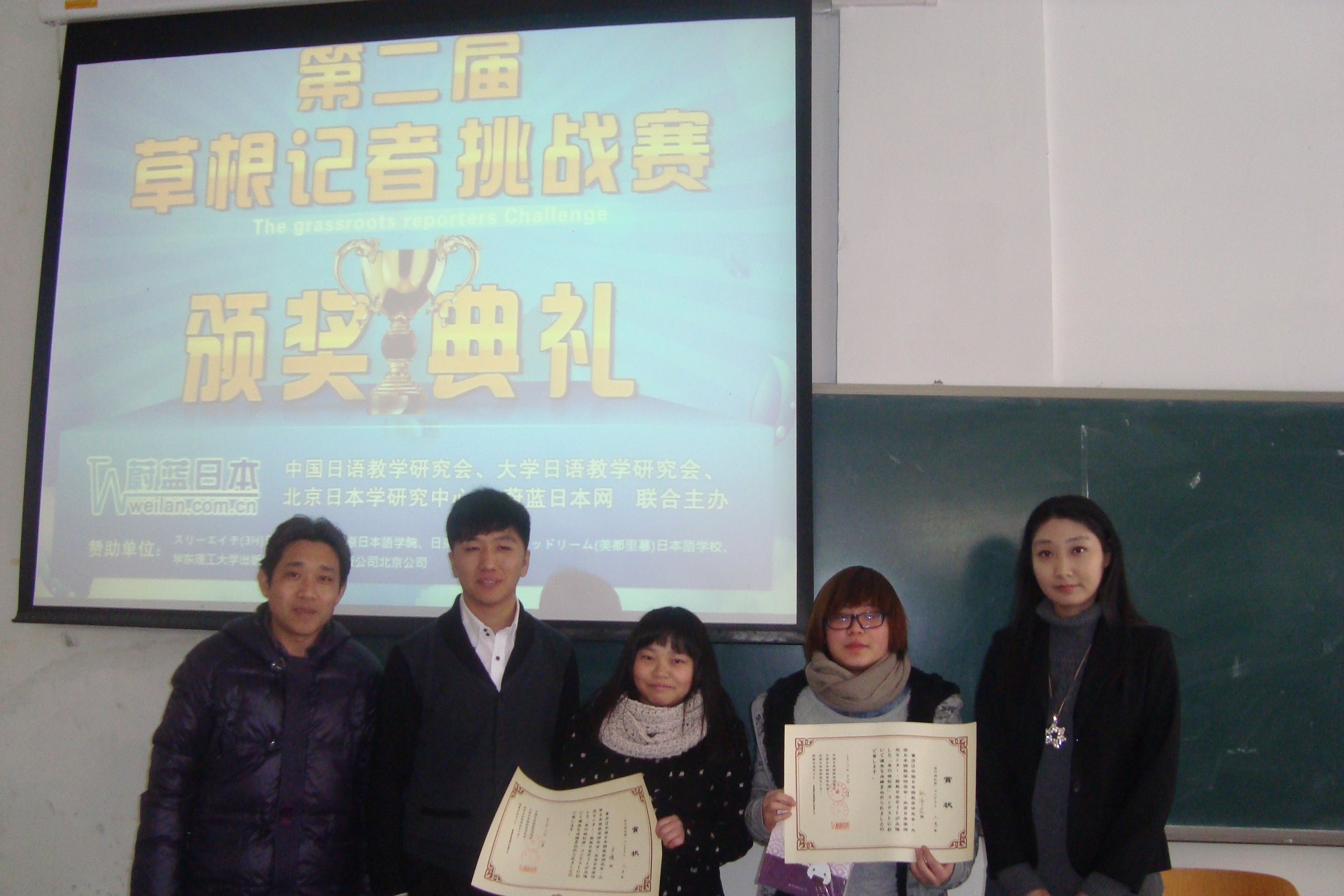 (学生记者 周博 日语1314)2013年12月25日在我院日益101举行了第二届草根记者大赛颁奖典礼,此次大赛由蔚蓝集团举办并发起,我院外语系学生积极参加。孙沛苡、尹媛同学获得了本次大赛的三等奖的好成绩。