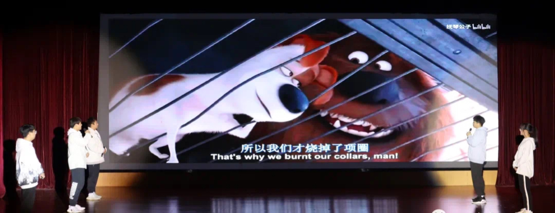管理学院旅专2101班万欣然演讲《This is China》则用自信和澎湃激昂的句子向观众诠释了中国的沧桑巨变和飞速发展。经济学院21级保险2101班的曹纯、沈佳怡、王博正、侯浩然和孙时俊杰,一段《爱宠大机密》的配音,凭借其标准的英语口语、俏皮的语音语调,惟妙惟肖的再现了电影中宠物们的对话,将现场气氛推到高潮,赢得同学们的阵阵掌声。