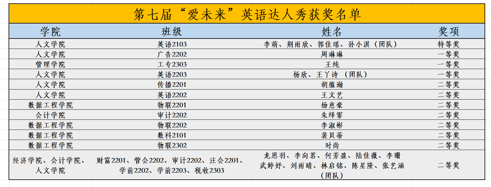 “爱未来”英语达人秀是由人文学院公共英语教学部倾心打造的精品赛事之一。作为我院英语第二课堂活动,赛事力求通过舞台展示学生风采,传递语言文化魅力,鼓励同学在今后的学习生活中更加自信地呈现文化底蕴和英语能力。
