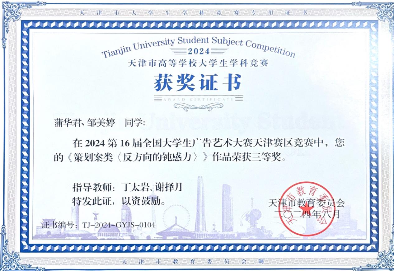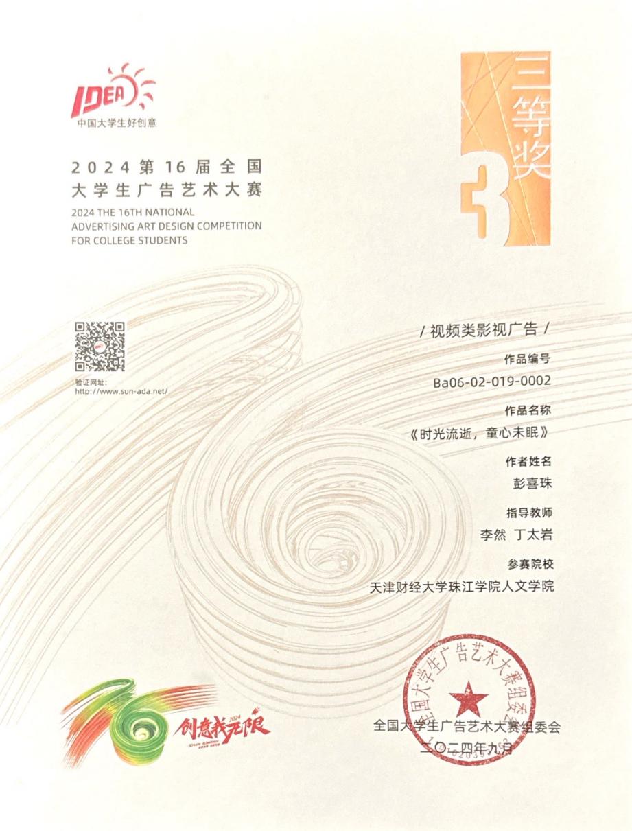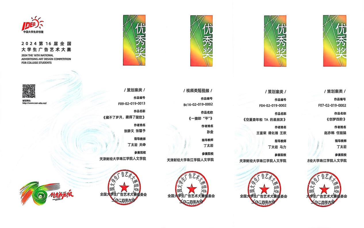 近日,2024年第十六届全国大学生广告艺术大赛成绩公布。人文学院广告学专业学生再次展现卓越实力,荣获全国三等奖 1 项,优秀奖 4 项;在天津市赛中,荣获一等奖1项,三等奖4项。