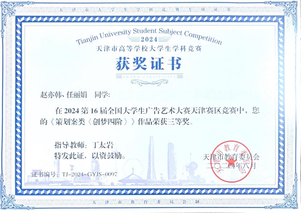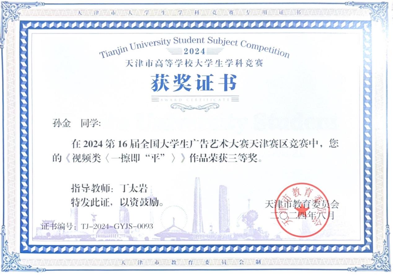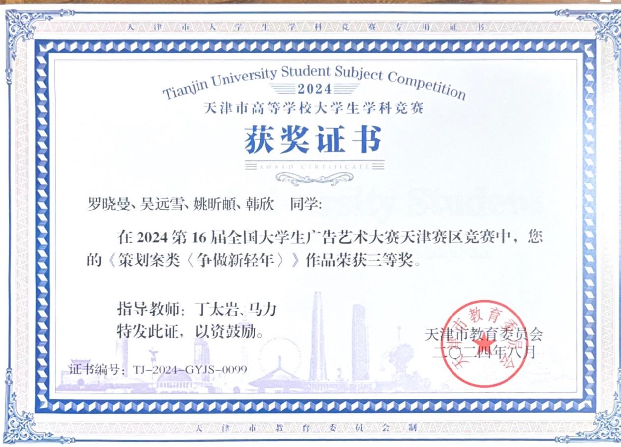近日,2024年第十六届全国大学生广告艺术大赛成绩公布。人文学院广告学专业学生再次展现卓越实力,荣获全国三等奖 1 项,优秀奖 4 项;在天津市赛中,荣获一等奖1项,三等奖4项。