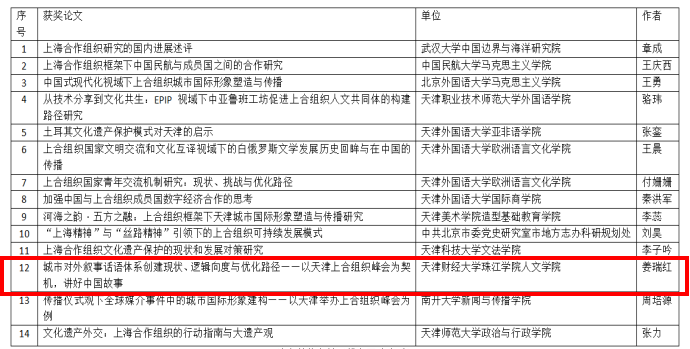 6月28日,“上合组织国家文明交流互鉴与可持续发展”研讨会在天津外国语大学钟楼报告厅隆重召开。人文学院教师姜瑞红向此次研讨会提交的题为《城市对外叙事话语体系的创建现状、逻辑向度与优化路径——以天津上合峰会为契机,讲好中国故事》的论文获优秀论文奖,并在会上作交流发言。