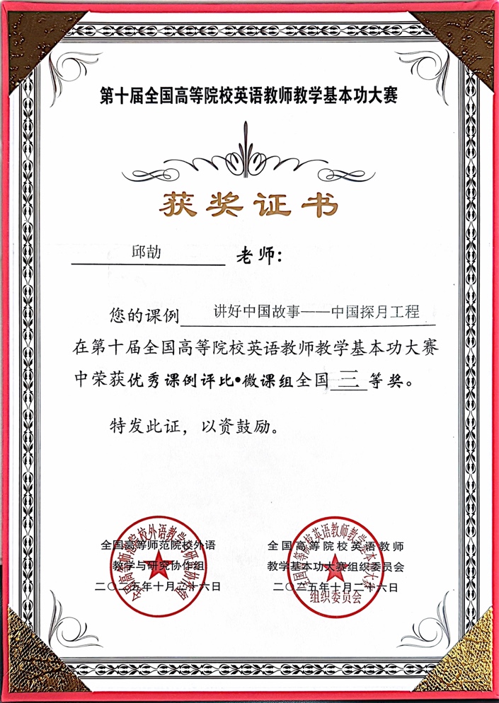 李沛老师的参赛作品以其长期科研方向“可操作性英语口语在线产出机制”为核心理念,聚焦英语口语教学的心理加工机制与可视化呈现,实现了科研成果向教学创新的有效转化。其微课以清晰的逻辑、独特的设计和深度的学术支撑获得专家一致好评,荣获微课组全国特等奖。同时,邱劼老师在大学英语教学中注重思政元素融入与中国文化表达的结合,探索通过英语课堂讲好中国故事、传播中国声音,荣获微课组全国三等奖。两位教师的成绩充分展现了我院教师在科研引领、思政融合与教学创新方面的综合实力。