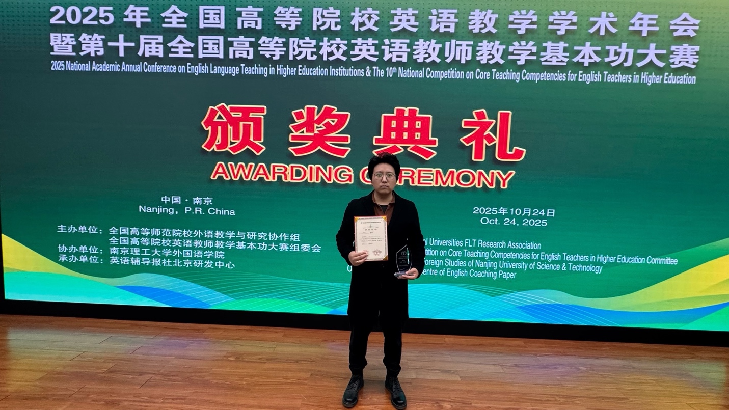 2025年10月23日至26日,第十届全国高等院校英语教师教学基本功大赛全国总决赛在南京理工大学举行。我院人文学院公共英语教学部教师李沛凭借扎实的教学功底和突出的创新能力,在全国总决赛中脱颖而出,荣获全国特等奖。这一成绩充分展示了我院教师在高校英语教学领域的专业实力与创新风采,为学院赢得了荣誉。