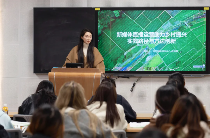 立足于《“互联网+传媒”创意传播》课程教学需要,10月29日下午,由传播学教研室主办的宝坻区融媒体中心公益助农直播分享会在日新206举行。本次分享邀请宝坻融媒公益助农直播团队负责人、出镜主播庞晓晨担任主讲,她通过一线实战经验,展示了融媒体直播在助力农户增收、服务地方发展中发挥的新作用,为师生们带来新媒体赋能乡村振兴的生动一课。