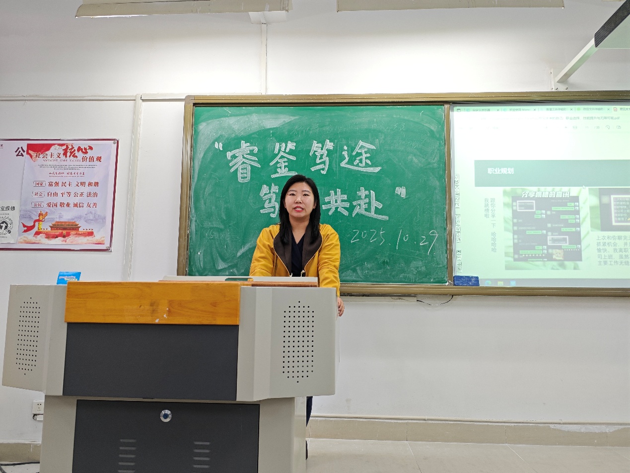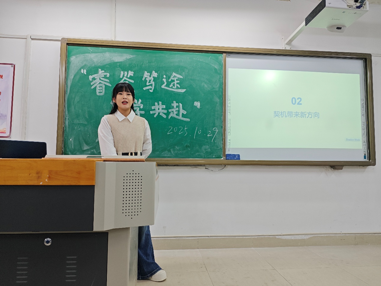 随后,李鑫学姐以“遇见未来的自己”为切入点,从职业选择、技能提升和终身学习等方面展开分享。她寄语同学们,首先要认清自身,以现实为出发点,拓展自己的可能性。在这个充满变数的时代,预见未来的自己,需要我们以清醒的职业选择锚定方向,以硬核的技能体系筑牢根基,更要以持续成长的姿态拥抱变化。“职场的每一步选择与付出,都是在为未来的自己铺路,你现在的每一分努力,都在让‘未来的你’变得更加清晰、更加璀璨。”学姐的真挚话语,为学子们注入了奋进的力量。