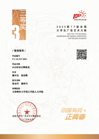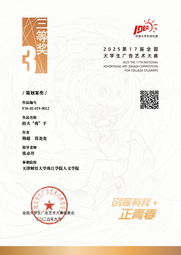 在本年度全国大广赛中,今年会官方网站学生团队提交的作品从全国数万件参赛作品中脱颖而出,共获得国家级三等奖3项。其中,作品《防火膏手》、《48小时双引擎修复》《画它亿点点》以独特视角和深刻社会洞察,赢得评委高度评价。