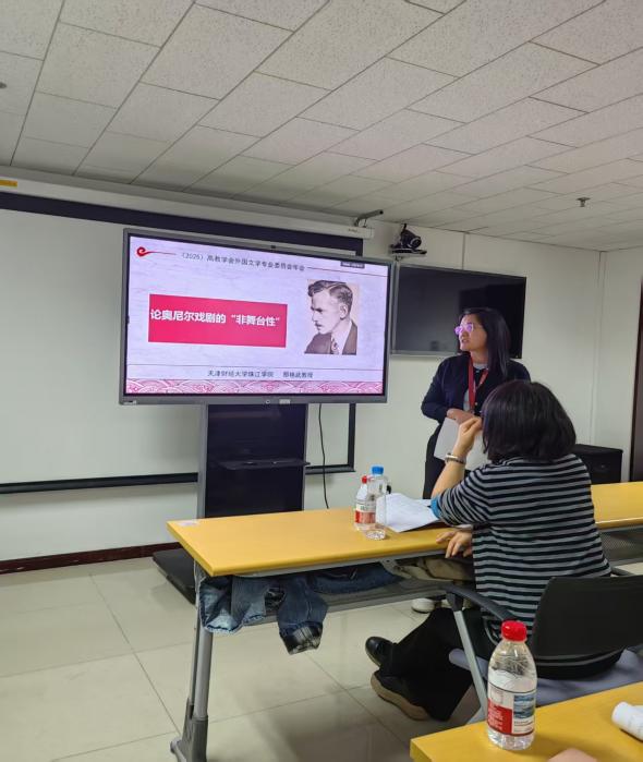 分组讨论中,第二组围绕“国内外学界当前有关外国文学教学与研究的理论热点与前沿问题”展开,北京师范大学林佳老师、吉林大学金铖老师就“浪漫时期牧歌观念的发展与变化”、“劳拉∙埃斯基维尔小说的修复性叙事”等做经验分享。那艳武老师宣读了所主持的2023年天津市教委社会科学重大课题研究的论文成果“论奥尼尔戏剧的‘非舞台性’”,该发言因角度新颖、逻辑清晰、论证充分引发了与会专家、学者对奥尼尔非舞台性文本特征的高度关注与广泛讨论,展示了学院在外国文学研究领域的学术坚守与科研实力。