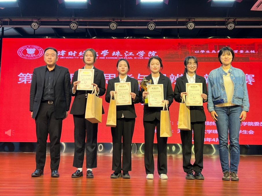 郭鑫老师与毕玉老师为冠军管理学院三队颁发奖杯、证书及奖品,周圆老师与白晶丽老师为亚军数据工程学院一队颁发奖杯、证书及奖品,张传杰老师为最佳辩手赵美烨同学颁发证书及奖品。