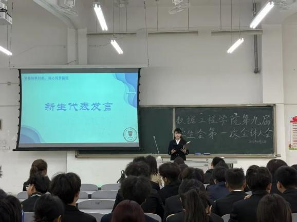 大会第四项新生干事代表靳易儒同学发表了就职演讲。她首先感谢了学院领导和老师的信任以及全体成员的支持,细阐述了新一届学生会的工作思路与规划。并希望新一届学生会将继承和发扬学院的优良传统,秉持着学习态度,在各自的岗位上认真对待每一项工作,以思想引领为先导,以服务同学为核心,她号召全体成员以饱满的热情和务实的态度,携手共进,共同推动高质量发展,书写数据工程学院学生会新的辉煌篇章,为服务同学,建设优良校园环境贡献新生。