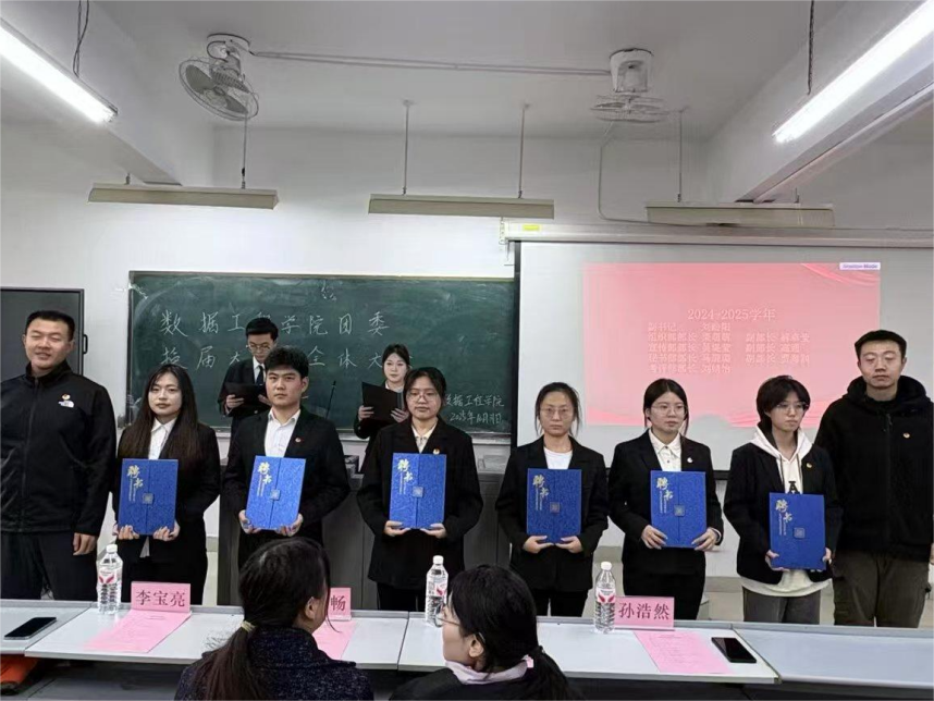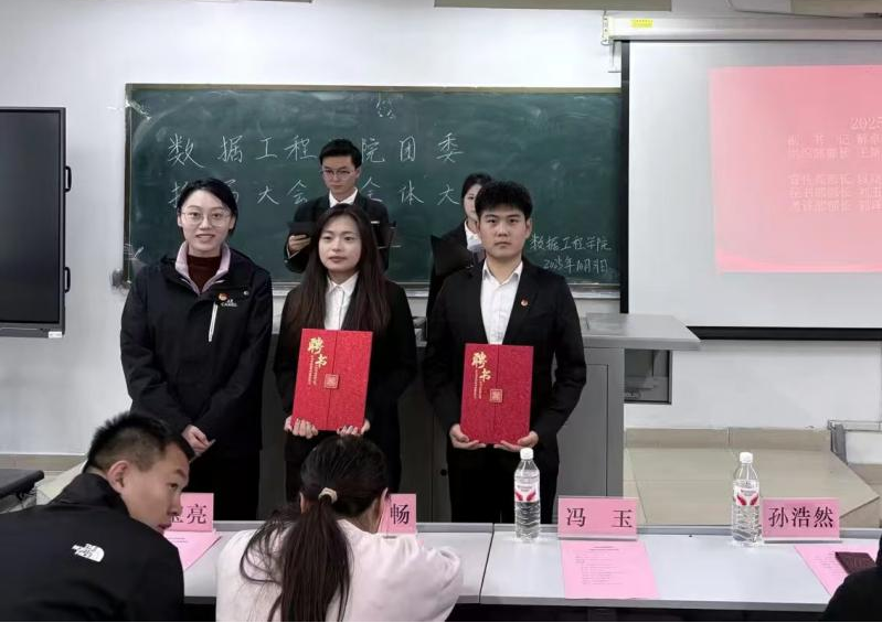 随后,大会举行新一届团委干部聘书颁发仪式。数据工程学院团委书记冯玉为副书记颁发聘书,辅导员老师李畅为组织部、宣传部部长颁发聘书,解卓莹、贾海润为秘书部、考评部部长颁发聘书。