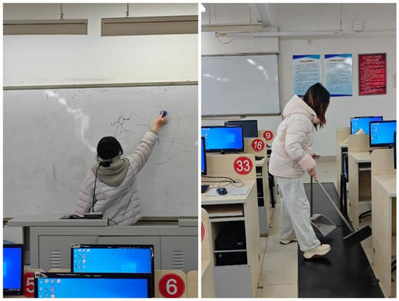 本次志愿清洁服务活动在日新楼二至四楼机房开展,志愿者们分工协作、认真细致,对黑板、粉笔槽、讲台、多媒体设备、地面垃圾、桌椅及卫生死角进行了全面清理,为广大师生营造了舒适的教学环境。同时,志愿者们向全体同学们发出文明倡议,倡导大家共同爱护校园环境,养成良好卫生习惯。