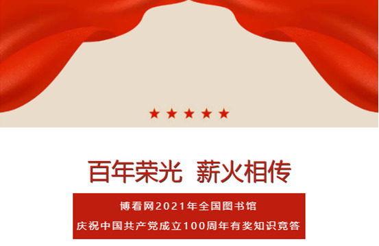 2021年是中国共产党成立100周年,也是“十四五”开局之年和“两个一百年”历史交汇的关键节点。为深入学习贯彻习近平总书记在党史学习教育动员大会上的重要讲话精神,在中国共产党百年诞辰来临之际,博看网联合全国图书馆举办“百年荣光 薪火相传”有奖知识竞答,引导广大读者学史明理、学史增信、学史崇德、学史力行,学党史、悟思想、办实事、开新局,以昂扬姿态奋力开启全面建设社会主义现代化国家新征程,以优异成绩迎接建党一百周年。