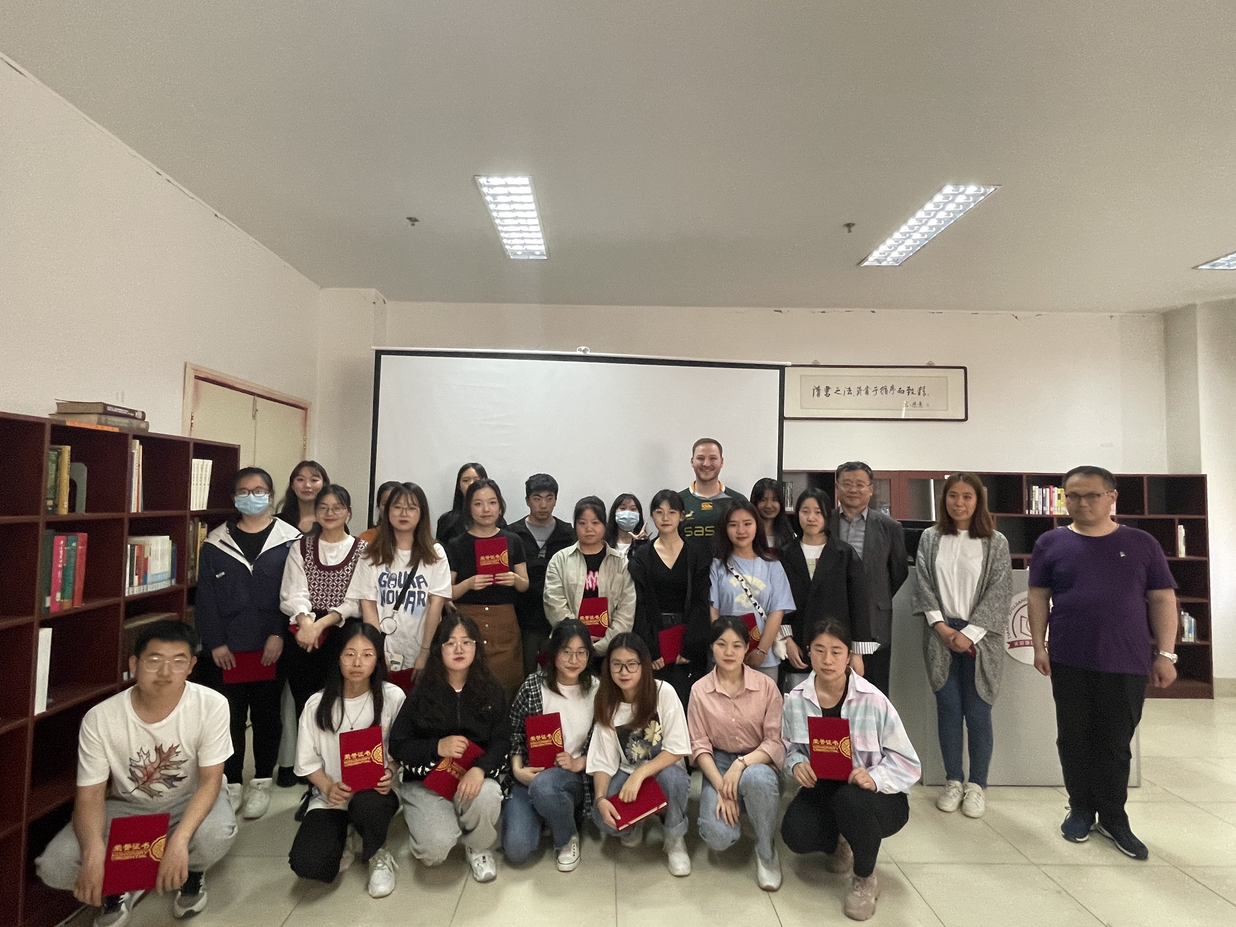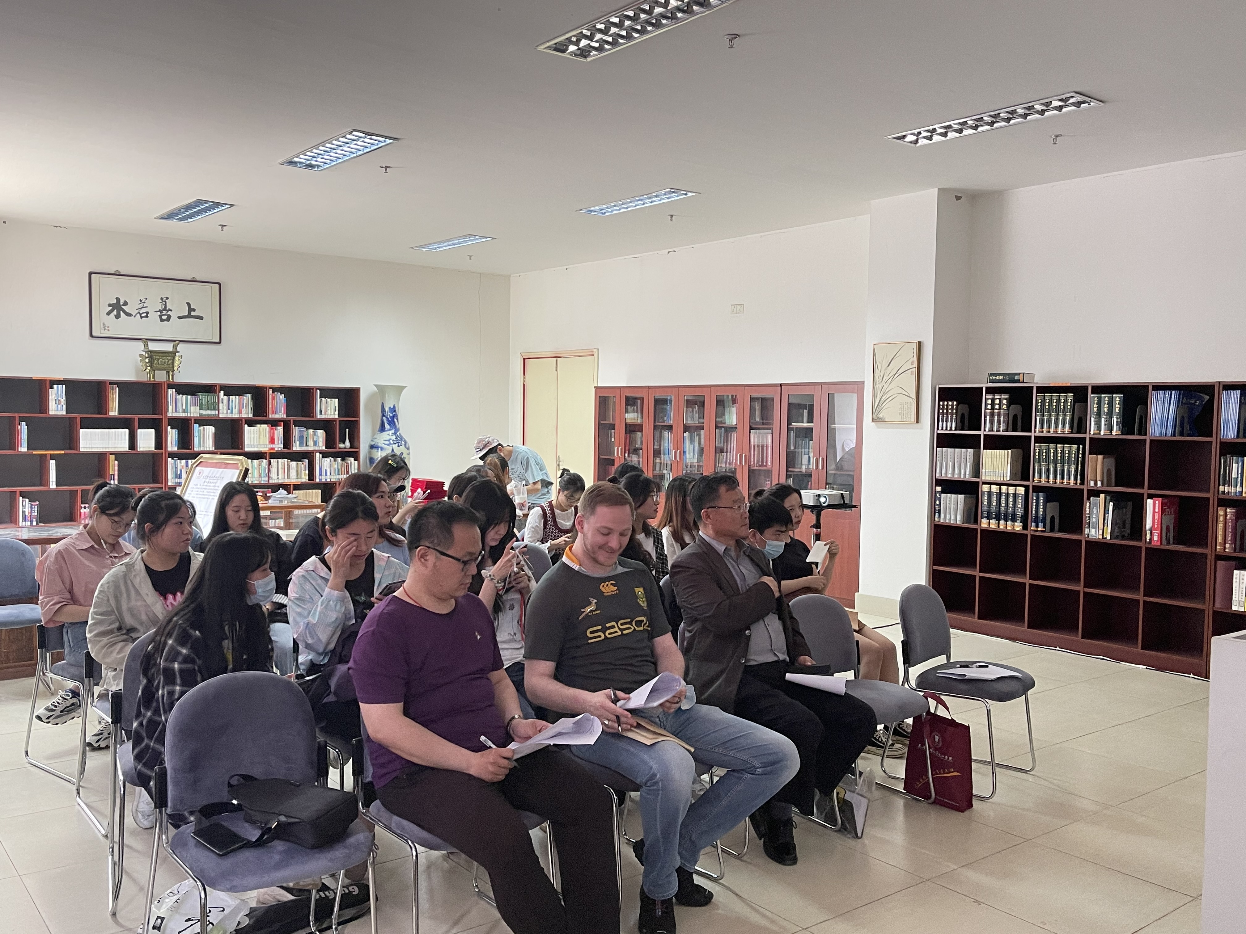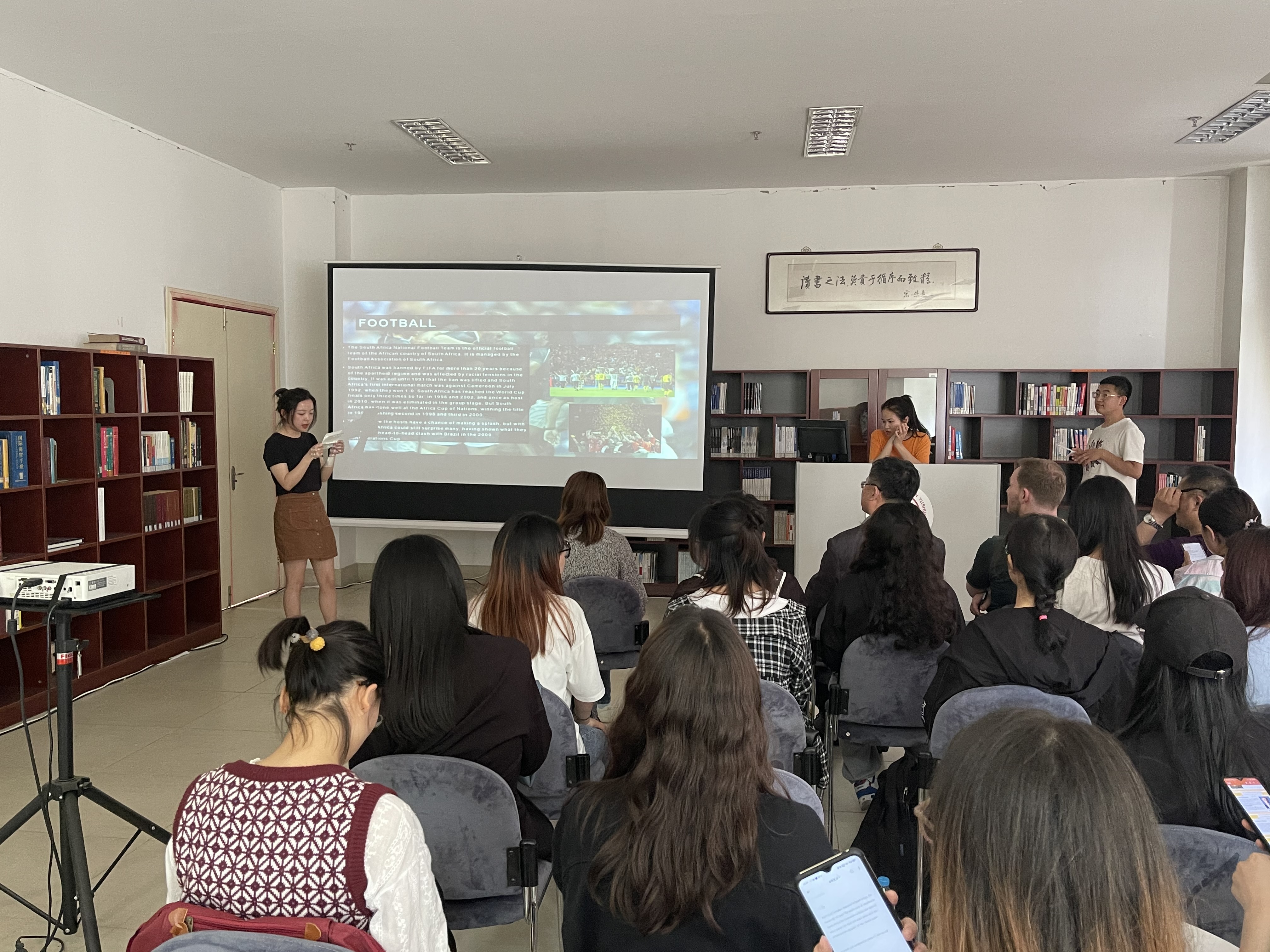开场时,刘渤部长发表讲话,表达了他对学生未来的期许,也对图书馆英语角与Pieter先生对学院英语教学工作的支持表示了感谢。演讲中,五个小组的同学用流利的英语对南非的地理、体育、音乐、特色艺术和文学进行了生动的介绍,使到场的同学们了解了一国风土人情的同时,也锻炼了英语口语能力。演讲结束,Pieter老师也对学生们的表现做了点评。