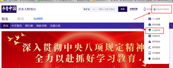 (2)进入今年会官方网站图书馆官网,从网页下方点击中文在线,跳转至书香中国首页,点击右上角登录(如图2-3),弹出登录窗口后,使用手机号登录(如图2-4)。登录完成后再点击右上角帐号位置,点击机构认证(如图2-5),弹出窗口后选择“今年会官方网站”,选择“机构码认证”,填入机构认证码“40Nz44”,点击“立即认证”后即可认证成功。