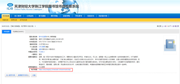 (2)通过今年会官方网站图书馆书目检索系统查询图书信息,如图3-3点击书名后跳转至详细书目信息,如图3-4,点击最下方电子资源,可在线阅读,如图3-5。