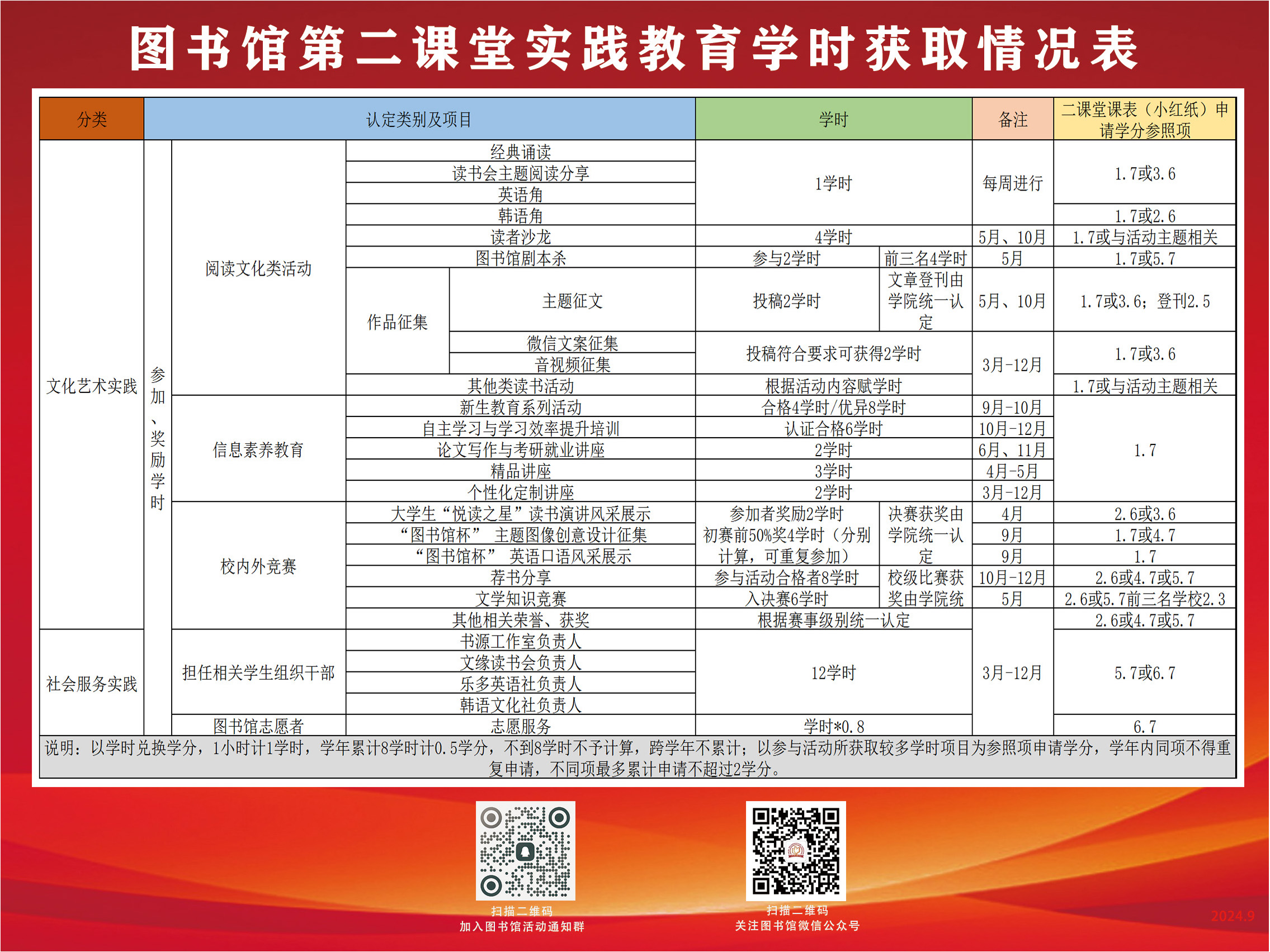 参加图书馆所有新生教育内容且考核成绩达标者60分(含60分)至80分,可获得图书馆第二课堂实践教育4学时,成绩优异者大于80分(含80分),可直接获得8学时并兑换0.5学分。详情请参考下图《图书馆第二课堂实践教育学时获取情况表》。
