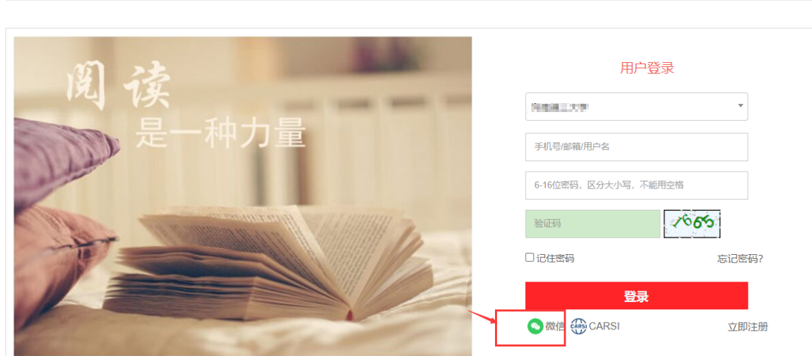 输入PC端网址,直接点击微信图标,用之前IP范围内认证登录过的微信扫描页面上的二维码即可登录阅读。