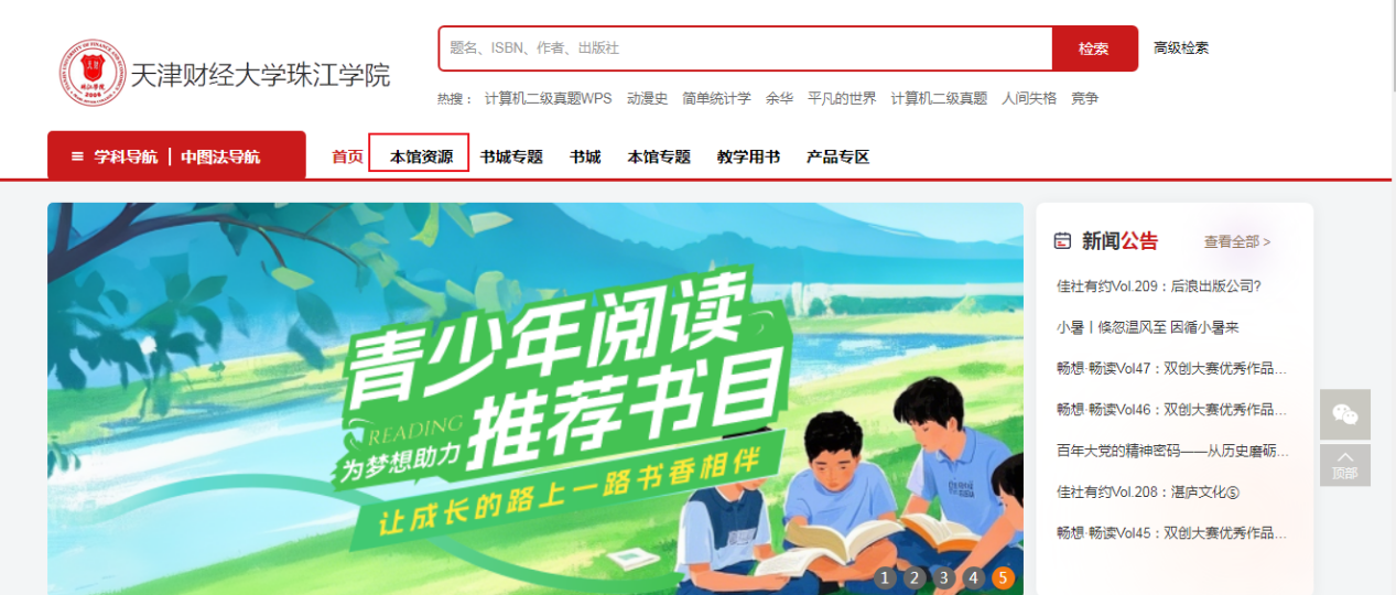 1、在首页导航栏直接点击“本馆资源”即可全文阅读馆配电子图书。