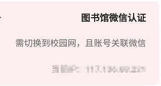 备注:采用“图书馆微信认证”读者需要在IP范围内认证(校园IP范围内有线网络或无线网情况下方可认证成功),4G/5G移动网络或者外部网络无法认证成功。