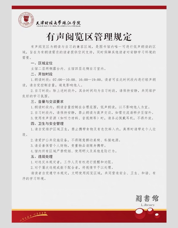 有声阅览区为朗读与自习兼容的区域,旨在为有朗读需求的读者提供空间支持,同时兼顾其他读者对安静学习环境的需要。因此请同学们按照该区域管理办法,合理安排使用: