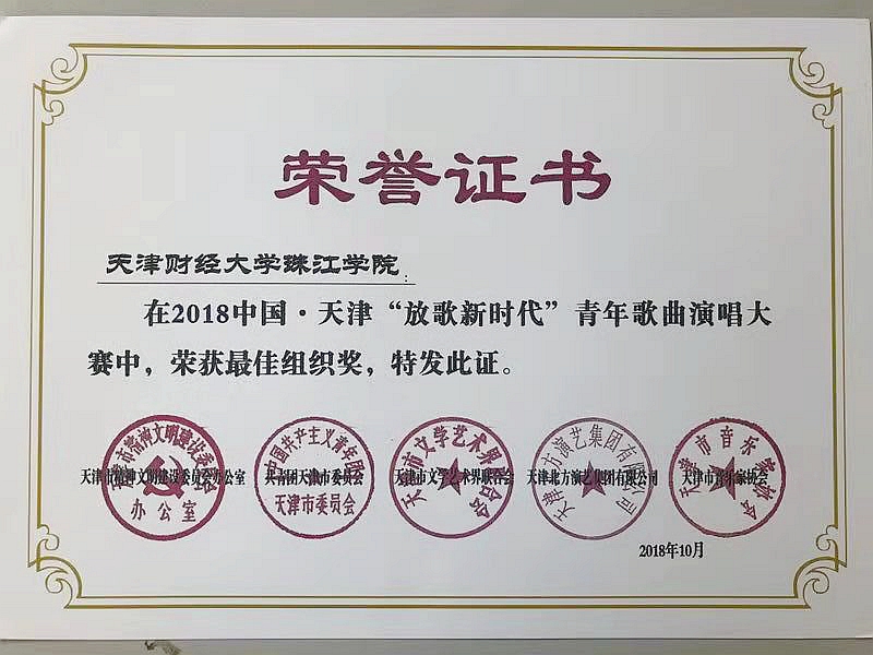 为喜迎改革开放40周年,由天津市精神文明建设委员会办公室、共青团天津市委员会、天津市文学艺术界联合会、北方演艺集团主办,天津青年友好使者艺术团、天津青年宫、天津市音乐家协会、天津广播电视台音乐广播联合承办的2018中国•天津“放歌新时代”青年歌曲演唱大赛、“青春梦 中国梦”青年诗歌朗诵大赛、“青春放歌新时代” 校园合唱大赛于近期圆满落幕。我院在青年歌曲演唱大赛和青年诗歌朗诵大赛中获得最佳组织奖,学院大学生合唱团参赛作品在校园合唱大赛中荣获三等奖。
