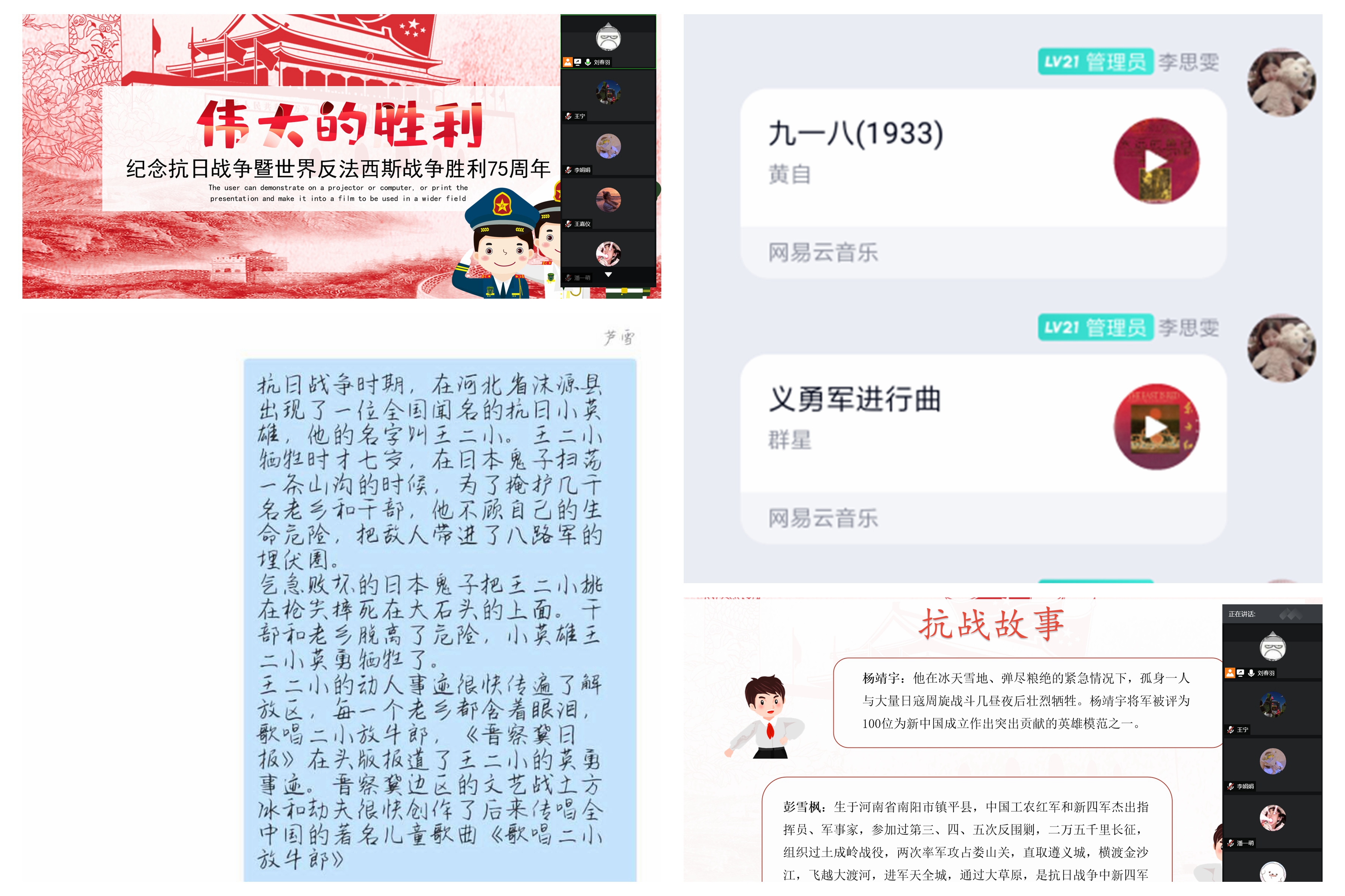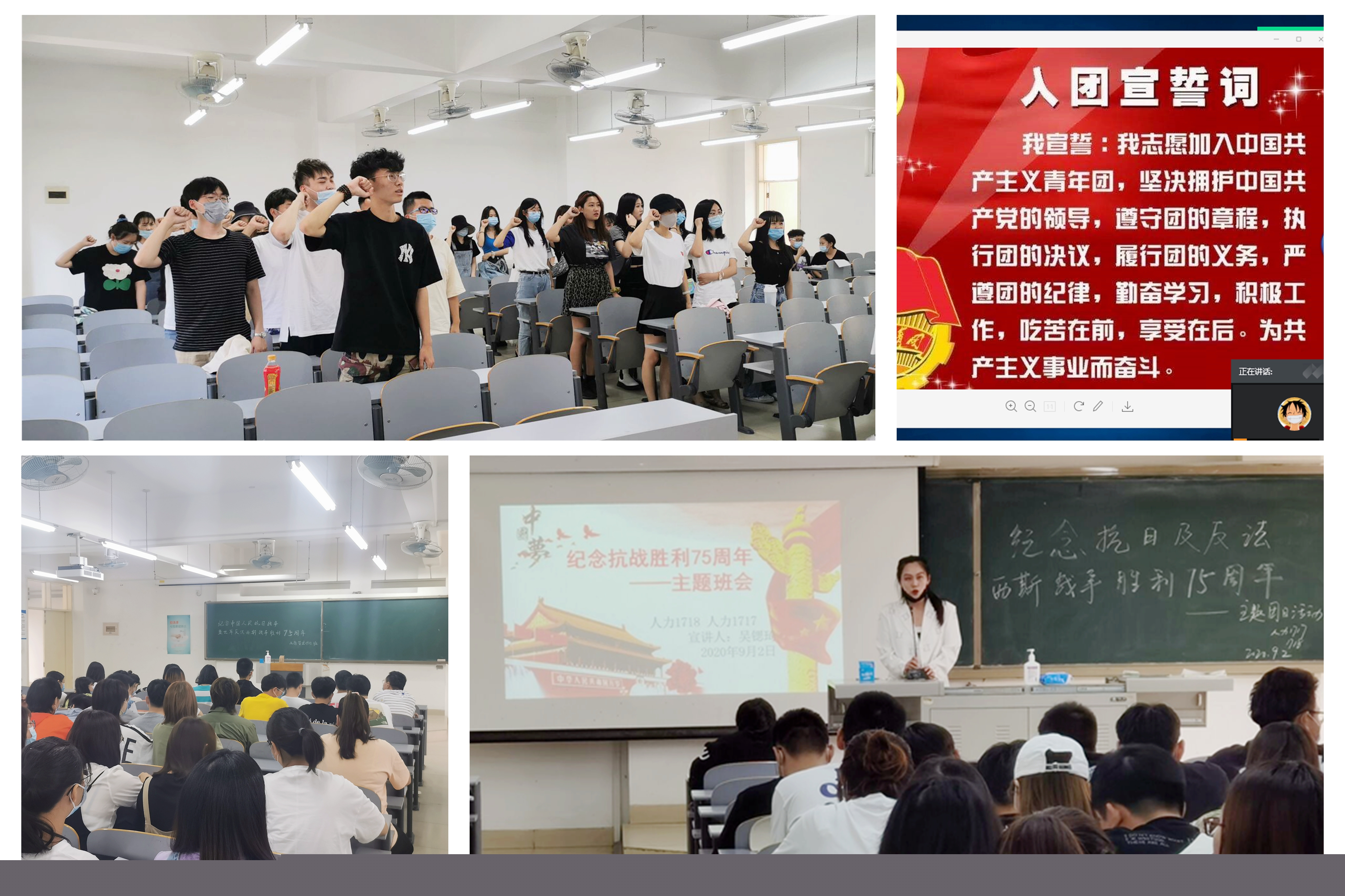 各班级团支部积极响应,线上线下活动同频共振。线下组织团员青年重温入团宣誓词、开展主题班会分享抗战故事。抗日小英雄王二小7岁时为掩护几千名老乡,把敌人带进八路军的埋伏圈后英勇牺牲。狼牙山五壮士面对日军和伪满洲国军,宁死不屈,义无反顾跳下数十丈深的悬崖。线上各支部观看《亮剑》等抗战影片、传唱《义勇军进行曲》《黄河大合唱》等抗战歌曲,分享观影心得体会。同学们沉浸在历史的长河中,感受着英雄先烈的爱国之志,他们表示会永记国家的胜利,总结历史经验,汲取历史教训,更好地开创未来。
