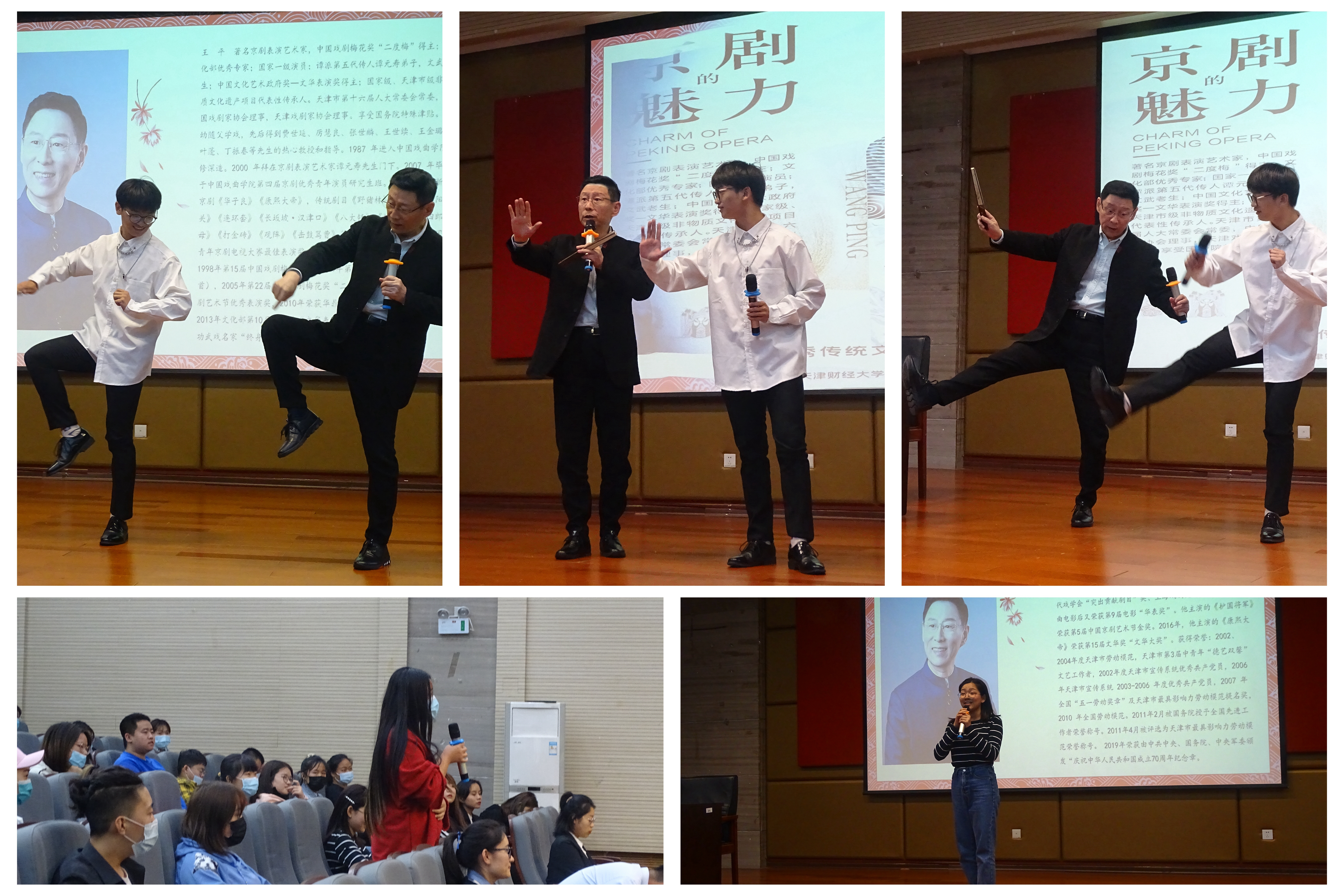 王平老师围绕“普及京剧知识”“创新传承发展”主题展开讲座,理论讲授与现场表演相结合。在表演方面,他认为应注重塑造人物精神气质,善于运用武技绝活;在创新方面,他坚持要讲究“移步不换形”,不盲目创新,丢掉戏曲本质的东西;在传承方面,他强调了勤学苦练的重要性:一天不练自己知道,两天不练同行知道,三天不练观众知道。为了让同学们更深刻地感受京剧魅力,王平老师现场表演解疑答惑,他醇厚的唱腔,娴熟的动作,引得台下师生掌声不绝、叫好声不断。同时,我院戏曲社同学们登台献唱,王平老师进行耐心细致讲解与点评,讲座结束后,同学们表示收获颇丰,纷纷与王平老师合影留念。