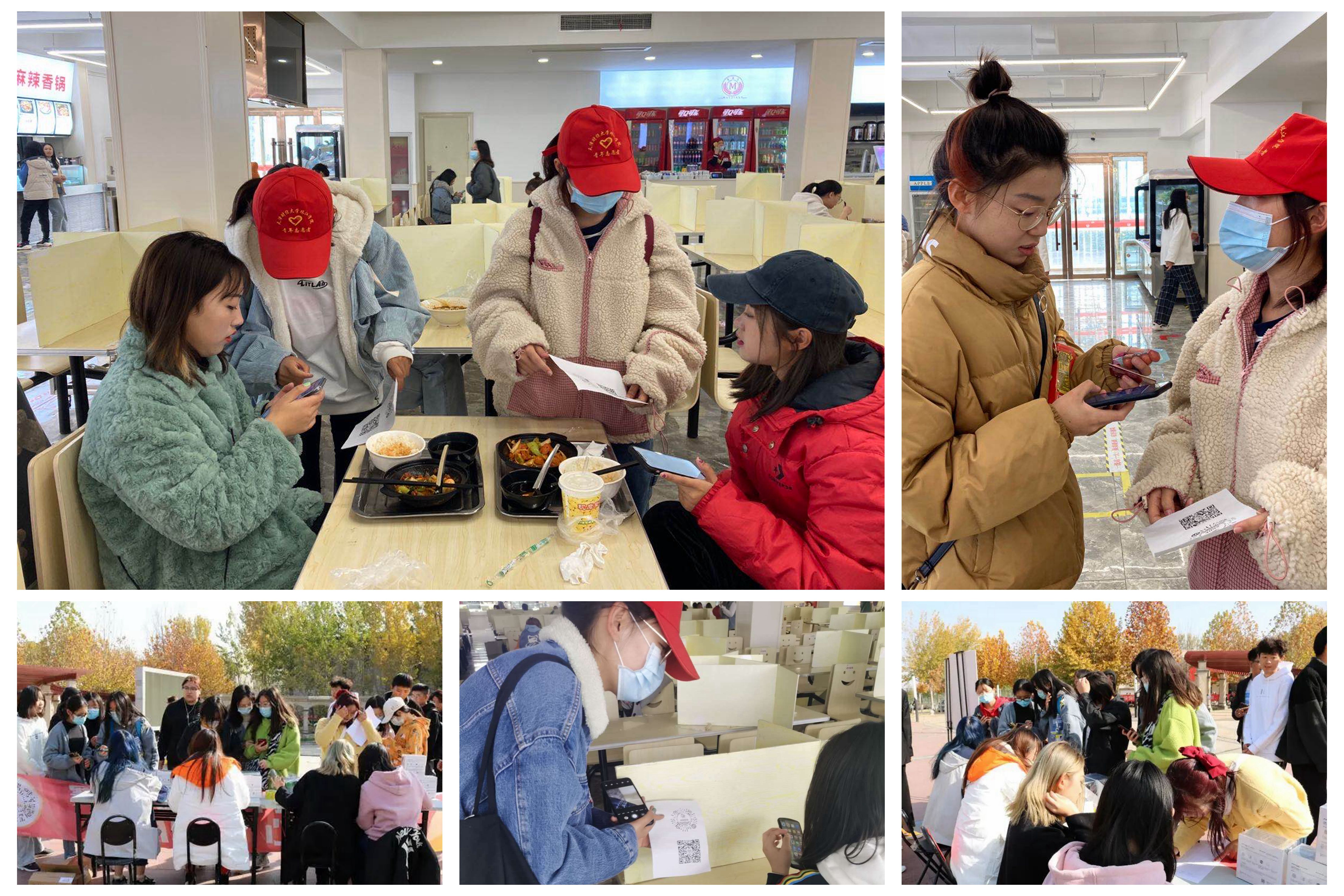 宣传工作于四个地点同时展开,分别位于一食堂一楼、二食堂一楼、二食堂二楼及小广场。在各部长的带领下,志愿者们佩戴口罩,戴着小红帽,手持二维码,在食堂人群中穿梭,积极向同学们宣传光盘活动的宗旨和意义,细心地给同学们介绍光盘打卡的规则及奖励,解答同学们的问题。在各位干事的耐心讲解下,同学们积极扫码参与,本次线下宣传工作取得圆满结束。
