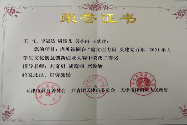 2021年6月,由天津市教育委员会、共青团天津市委员会和天津市津南区人民政府主办的“聚文创力量 庆建党百年”2021年大学生文化创意创新创业大赛圆满结束。我院有两个项目获奖,其中二等奖1项、创意优胜奖1项。