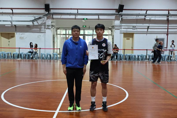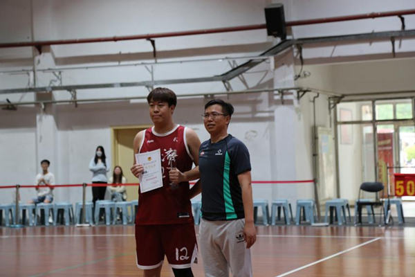 学院体育课部党支部书记高春盛为“三分球大赛冠军”彭佳豪同学颁奖