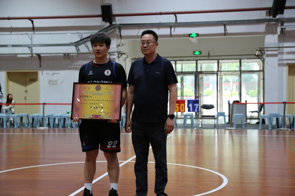 学院体育课部副主任褚孝勇为“最有价值球员”获得者温俊暄同学颁奖