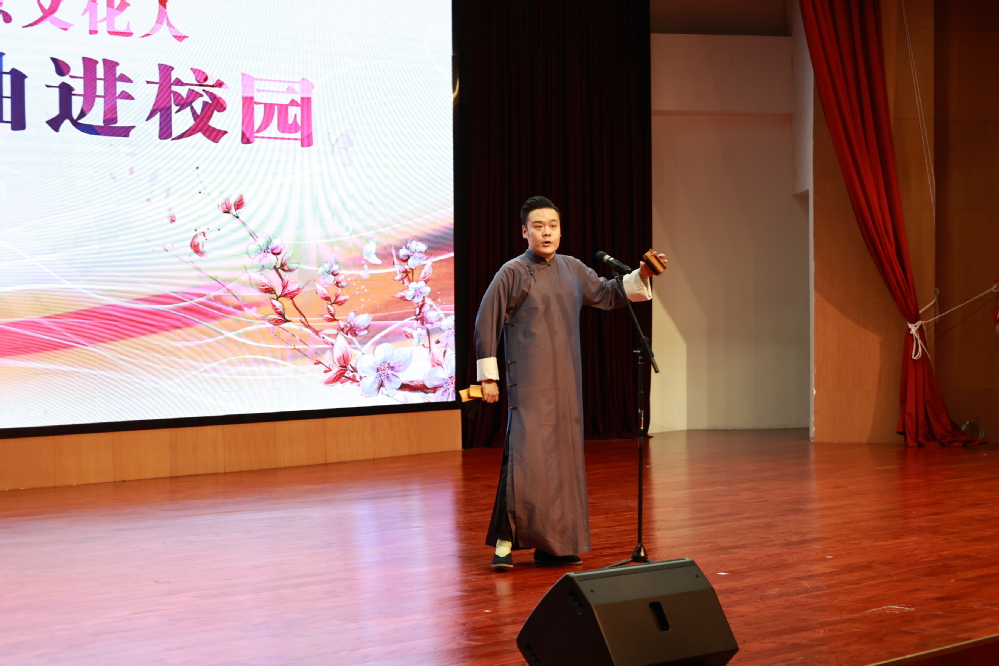 为弘扬中华优秀传统文化,厚植戏曲艺术的青春土壤,11月19日下午,“天津市戏曲进校园”专场演出活动在学院中和楼报告厅隆重举行。此次活动是由天津市教育委员会、天津北方演艺集团联合主办,天津市曲艺团携快板书、西河大鼓、相声、单弦等经典曲艺形式,用鲜活的表演让在场1000余名师生沉浸式体验了津味曲艺的独特魅力。演出由姜维红主持。