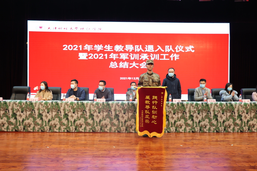 王猛向学生教导队颁发了锦旗以表彰他们在2021年学生军训承训中的优异表现。