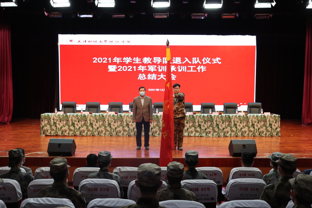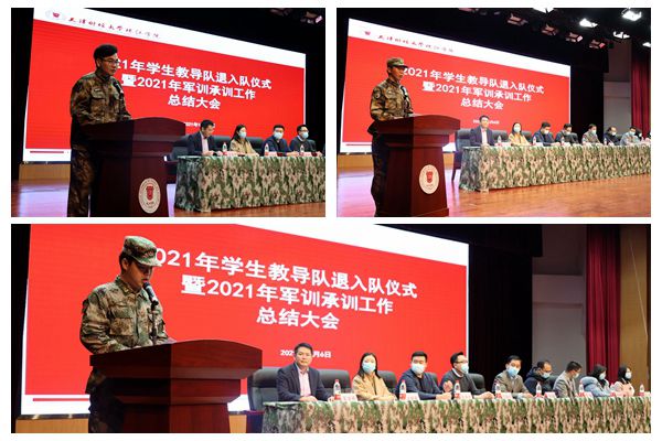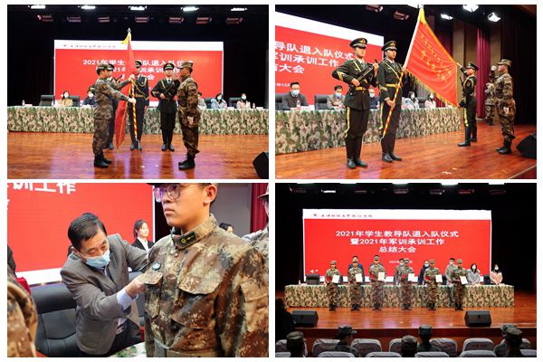 按照会议议程武装部干事阳涛宣布了学生教导队退队名单并宣读了《关于2021年学生教导队任命和组成人员的通知》,参会领导为退队队员颁发了证书和奖章,同时为新入队队员佩戴了臂章。退队队员代表数据工程学院信息管理与信息系统1810班赵世祺和新入队队员代表人文学院英语2103班余笑茹分别发言。新任命的学生教导队教导员薛蛟从原教导员赵世祺手中接过队旗后,带领全体队员面向队旗宣誓队训:苦练军事技能,争做合格教官;苦学专业知识,争做四有青年;苦锻五项素质,争做榜样示范!