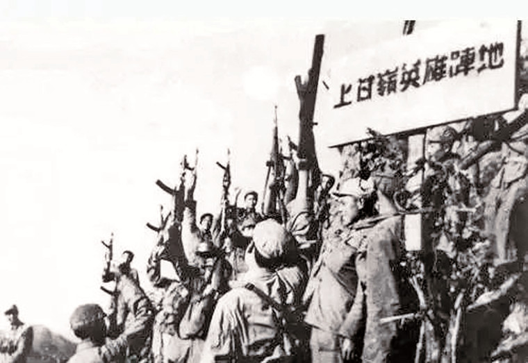 志愿军战士在上甘岭英雄阵地欢庆胜利。