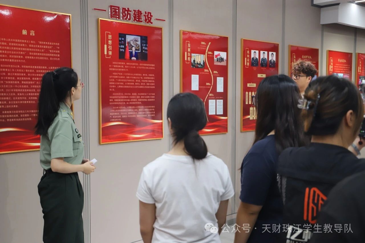 最后,主持人宣布学院第二届全民国防教育宣传月活动正式启动,详细介绍了相关活动安排和计划。并组织23、22、21级学生代表参观国防教育展室,大学生军人服务中心的工作人员进行了现场讲解。学生们在展室中认真聆听,这不仅激励了他们的爱国情怀,更让他们深刻理解了国耻不能忘、和平需珍惜的道理,同时也从中汲取了奋斗的力量。
