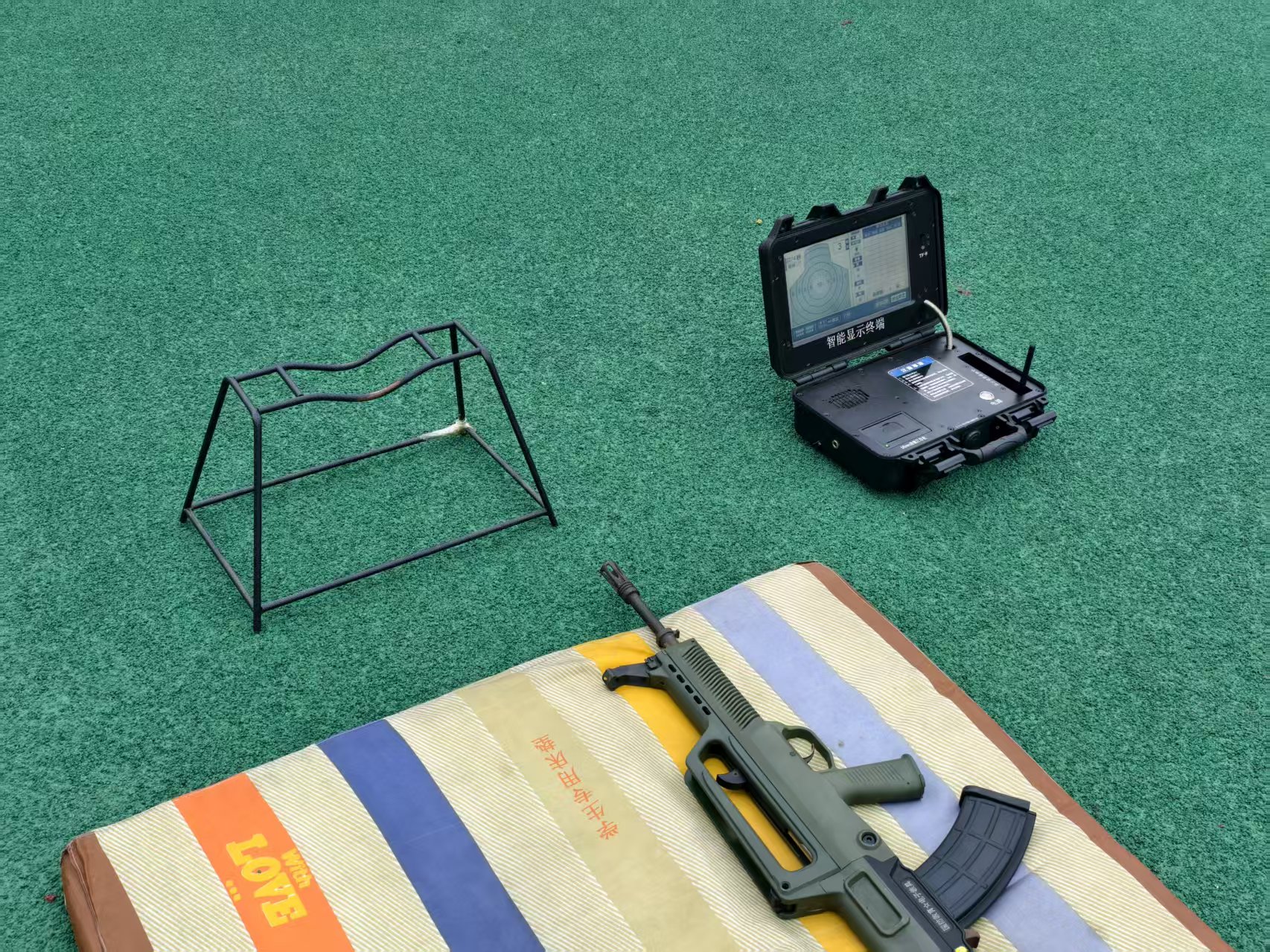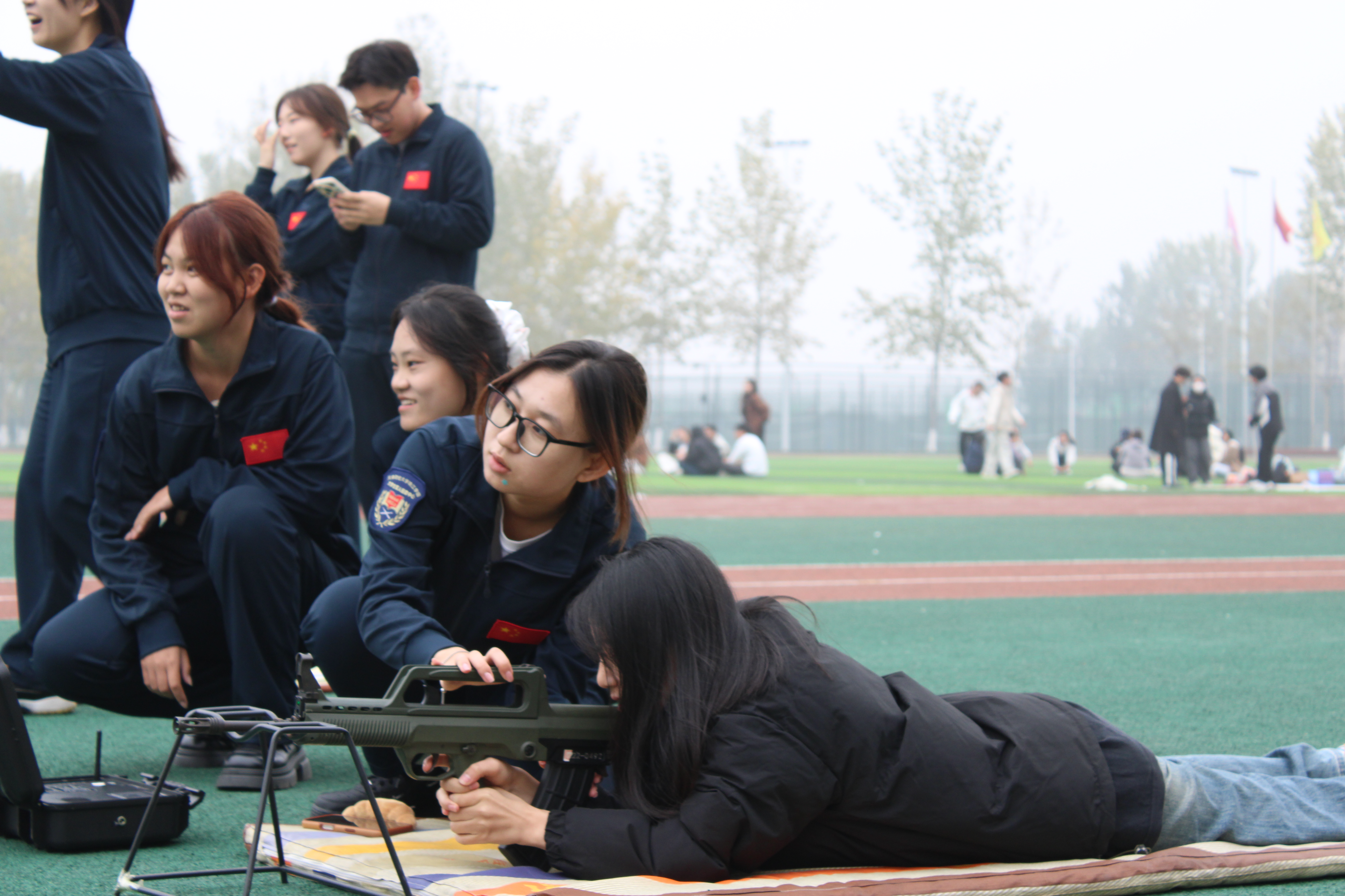 田径场塑胶跑道上,墨绿色靶纸与模拟枪械整齐排列。在大学生军人服务中心同学的指引下,参赛选手依次进入射击区域,俯身卧倒,进入射击准备状态。指导人员穿梭于各射击位间,细致纠正姿势、讲解动作要领,确保每位选手掌握基本操作规范。