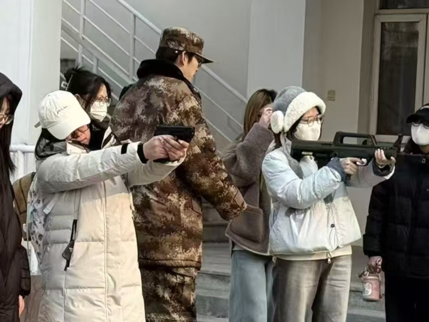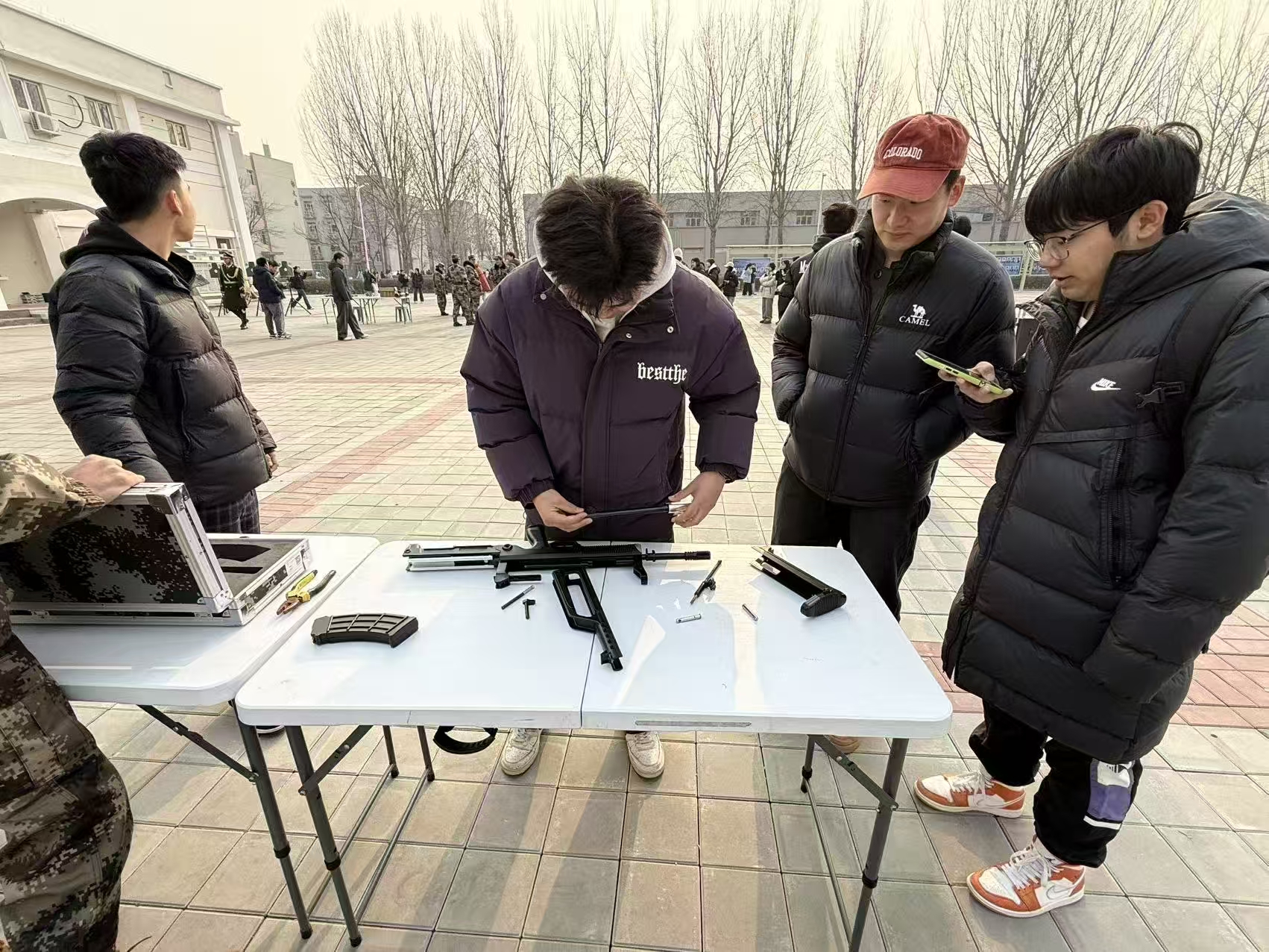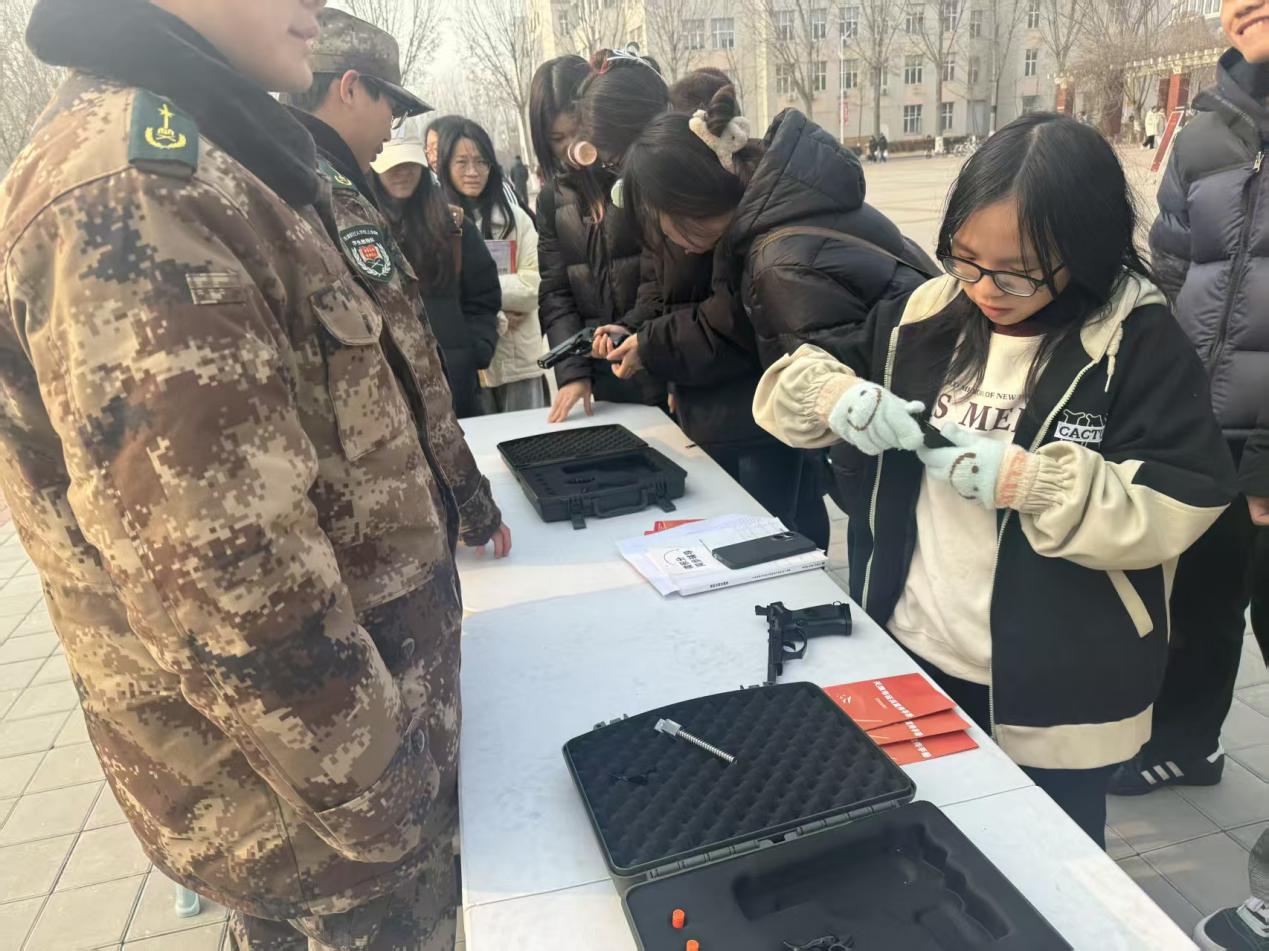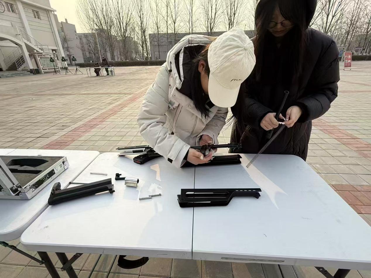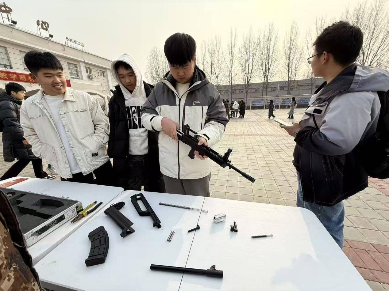 在枪支拆解体验区,学院教导队队员化身专业讲师,细致讲解模拟95-1式自动步枪、92式模拟枪的构造原理。同学们亲自动手拆解和组装,通过实操加深对国防装备的认知,仿佛打开了一扇通往军事装备世界的大门,对枪支的内部结构和工作原理有了更深入的了解。