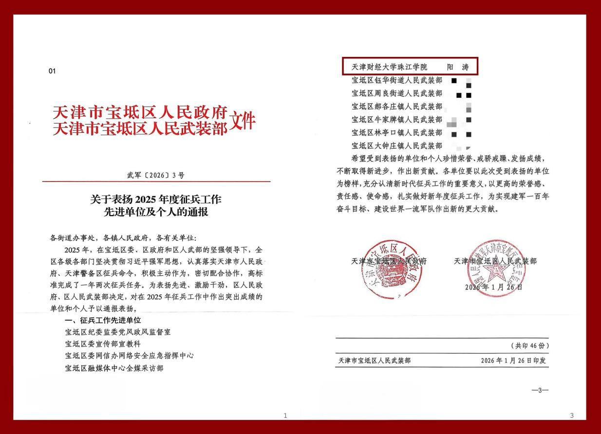 近期,天津市政府、天津警备区召开全市2026年征兵工作会议,宝坻区区政府、宝坻区人民武装部召开全区2026年征兵工作会议,宝坻区区委、区政府召开全区2026年党管武装工作会议。在三次会议中,市、区领导分别对2025年度全市和全区征兵工作进行全面总结,对表现突出的单位和个人予以通报表彰。我院被天津市人民政府、天津警备区授予“征兵工作先进集体”荣誉称号,武装部部长吴亚娟被天津市人民政府、天津警备区授予“征兵工作先进个人”荣誉称号;武装部干部阳涛被宝坻区人民政府、宝坻区人民武装部授予“征兵工作先进个人”荣誉称号;武装部部长吴亚娟被宝坻区人民武装部授予“优秀专武干部”荣誉称号。