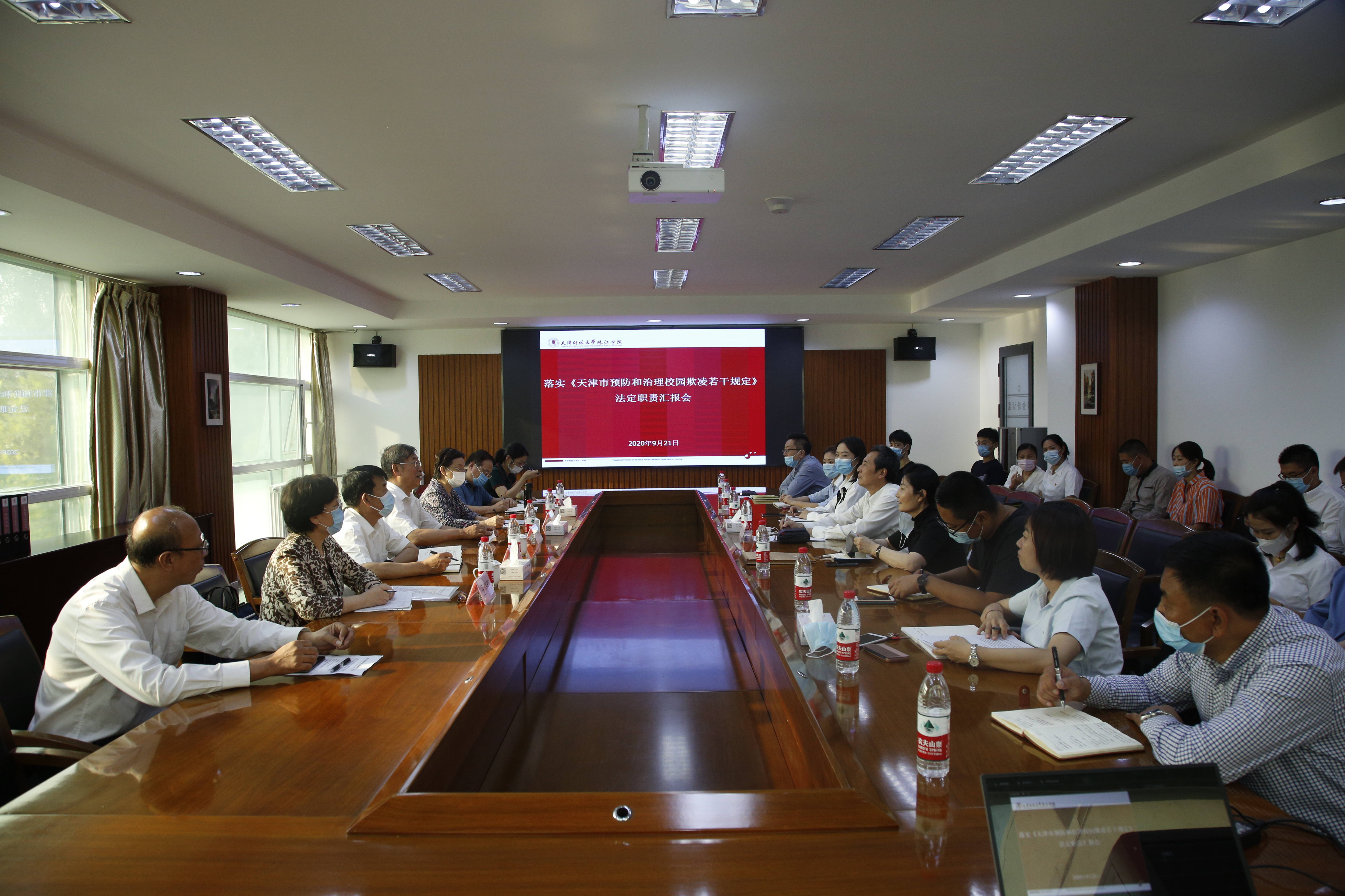 2020年9月21日下午,以市人大常委会委员,市人大教科文卫委主任委员马建标为组长的天津市人大常委会执法检查组莅临我院,对我院贯彻执行《天津市预防和治理校园欺凌若干规定》实施情况进行检查指导。检查指导组成员还有,市人大常委会委员市人大教科文卫委副主任委员刘玉红、市人大教科文卫委副主任委员吴惟义、市人大教科文卫委副主任委员王平、市人大常委会委员,市人大教科文卫委员会委员王晓红。学院党委书记李建航及各部门负责人、各二级学院学工办主任参加了工作汇报会。马建标组长主持会议。