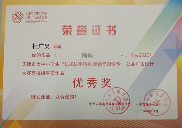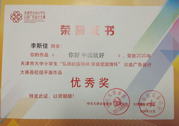 近日,2020年天津市大中小学生“弘扬抗疫精神 厚植爱国情怀”公益广告设计大赛圆满落幕。我院人文学院广告1806班李斯佳同学创作的《你好 中国就好》和杜广昊同学创作的《隔离》荣获优秀奖,我院荣获“优秀组织单位”称号。