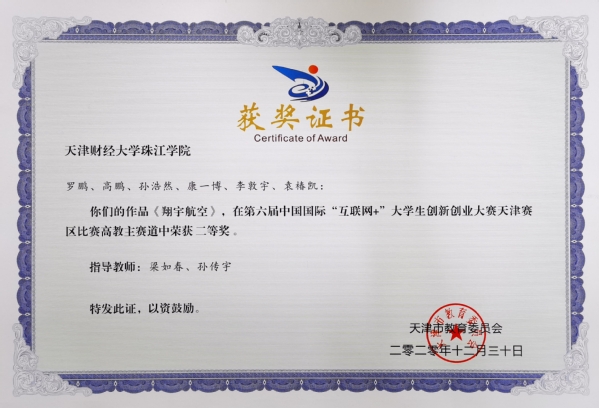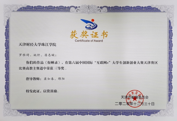 罗雅琦等同学参与的项目《衔蝉录》(梁如春等老师指导)、郭佳兴同学参与的项目《e品津味网》(余耀东老师指导)、王转等同学参与的项目《易摊信息服务APP》(余耀东老师指导)、杨若童等同学参与的项目《康寿医诊》(刘金岭老师指导)、刘文杰等同学参与的项目《博创机器人创意培训中心》(闫珊珊等老师指导),荣获主赛道天津市三等奖;付子钰等同学参与的项目《老有所依组织》荣获“青年红色筑梦之旅”赛道天津市三等奖。
