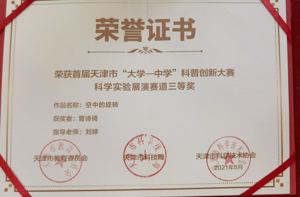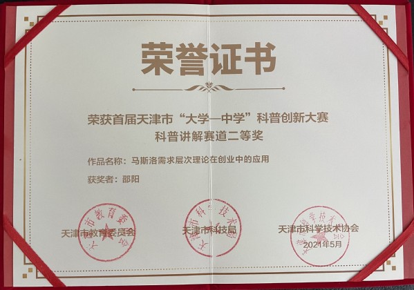 近日,我院学生工作部创业指导中心邵阳老师凭借作品《马斯洛需求层次理论在创业中的应用》在首届天津市“大学-中学”科普创新大赛中荣获科普讲解赛道二等奖;数据工程学院曾诗琦同学凭借作品《空中的旋转》荣获科学实践展演赛道三等奖。