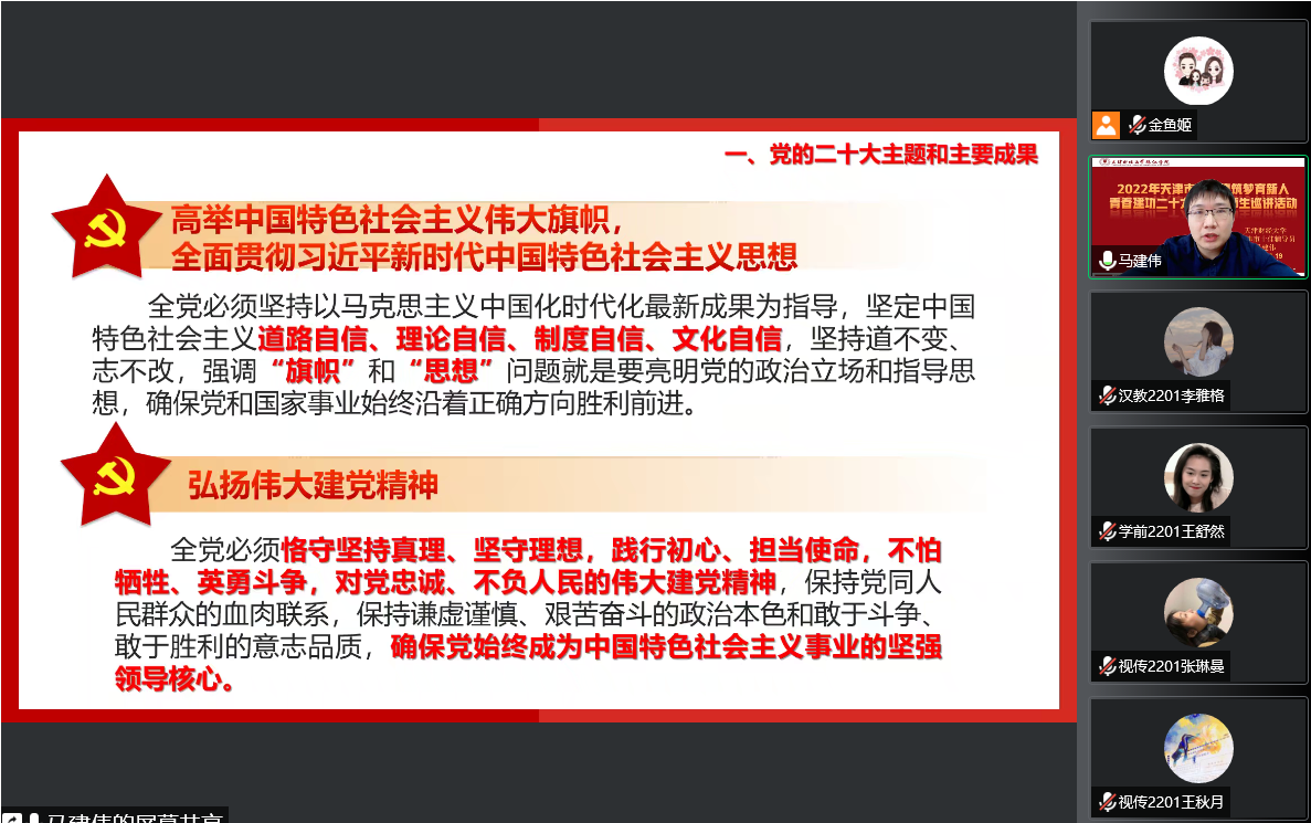 马建伟老师围绕深刻认识党的二十大主题及主要成果,过去5年工作和新时代10年的伟大变革,马克思主义中国化时代化新境界,中国式现代化的中国特色、本质要求和重大原则,全面建设社会主义现代化国家的目标任务,坚持党的全面领导和全面从严治党,应对风险挑战等七方面,结合青年的历史使命、责任与担当,对党的二十大精神作深入宣讲。